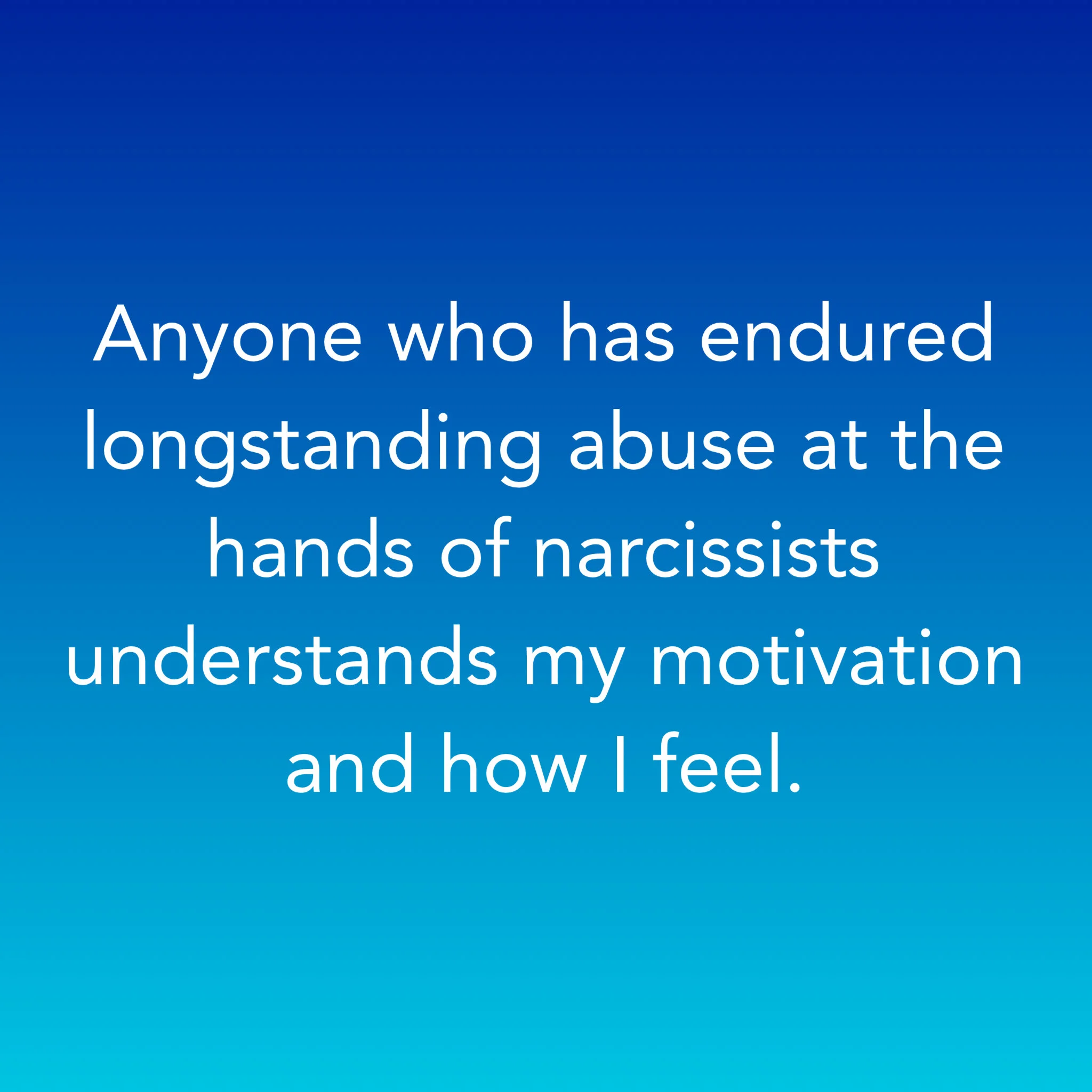 Anyone who has endured longstanding abuse at the hands of narcissists understands my motivation and how I feel.