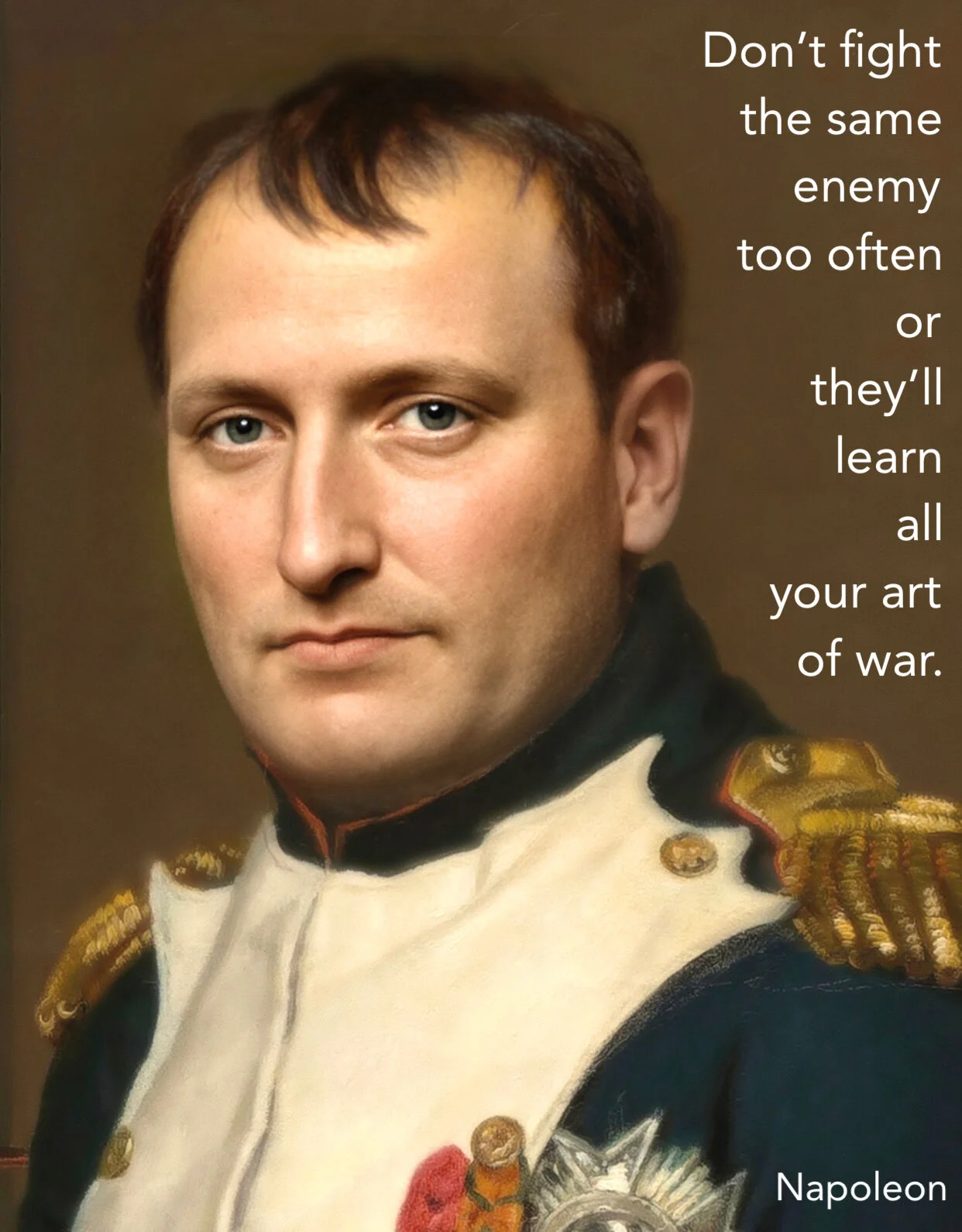 Ne combattez pas le même ennemi trop souvent ou ils apprendront tout votre art de la guerre. February 8, 2021 Kämpfe nicht zu oft gegen denselben Feind, sonst lernen sie all deine Kriegskunst. What’s in that bag of tricks.