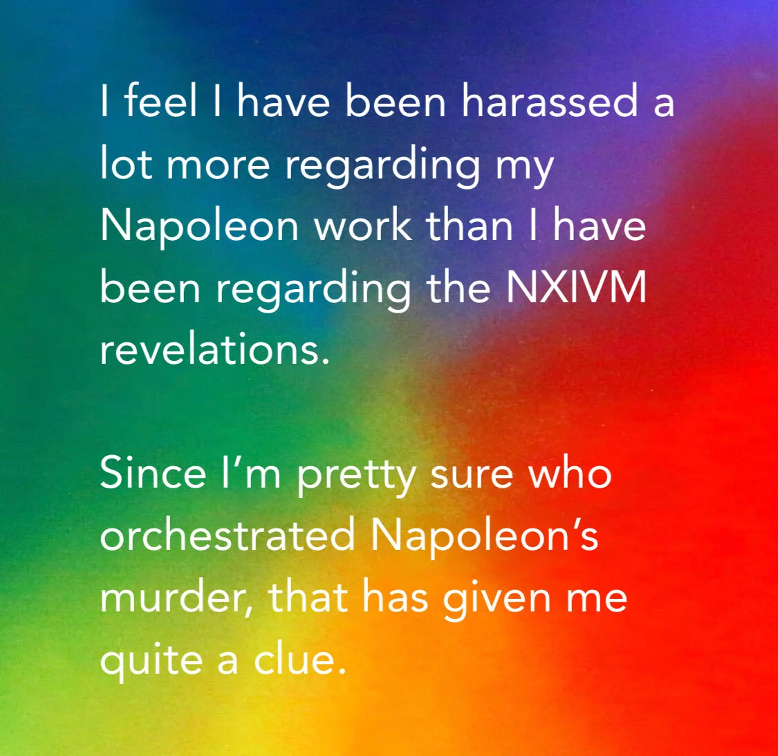 I feel I have been harassed a lot more regarding my Napoleon work than I have been regarding the NXIVM revelations.