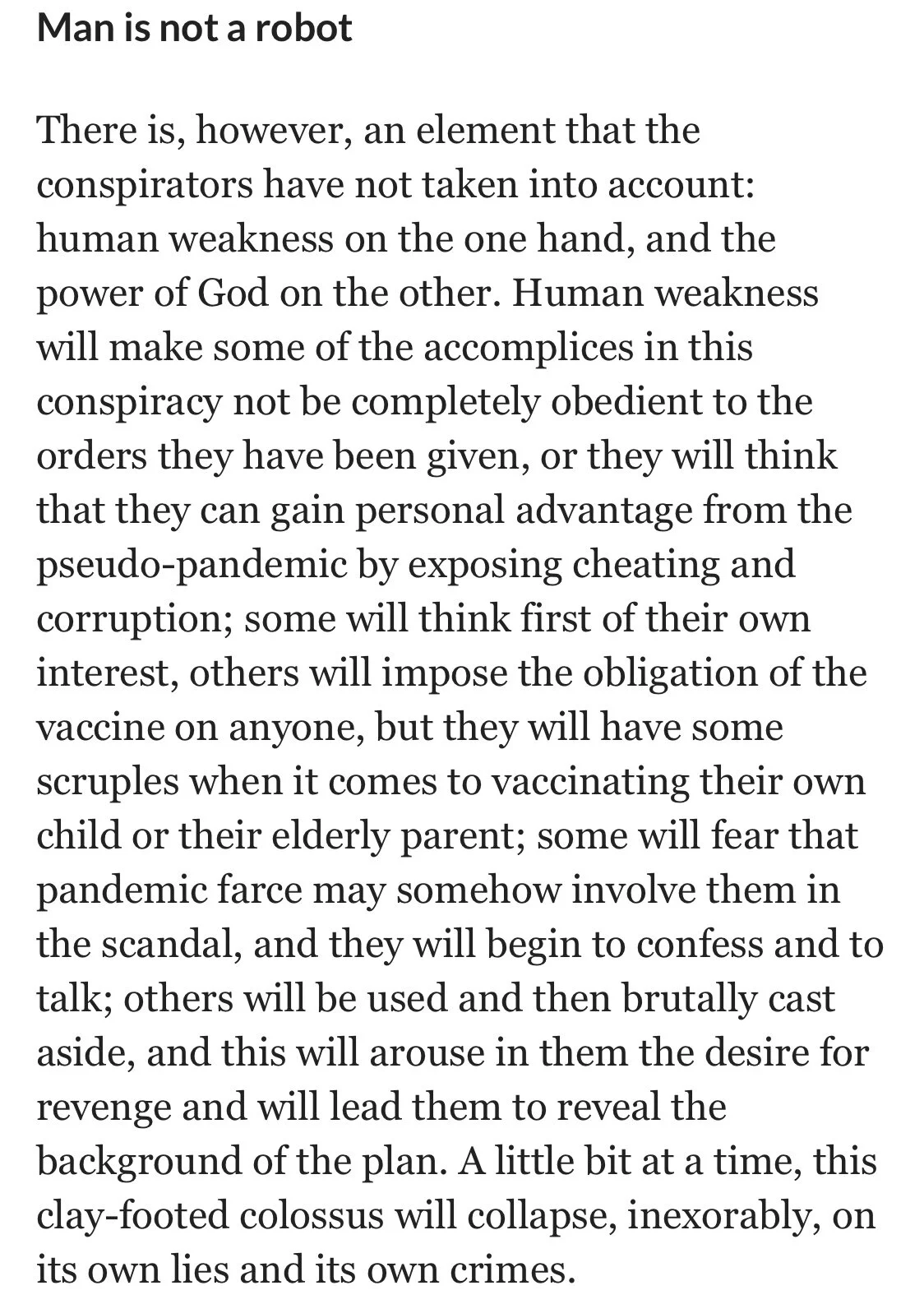 There is, however, an element that the conspirators have not taken into account: human weakness on the one hand, and the power of God on the other. Human weakness will make some of the accomplices in this conspiracy not be completely obedient to the orders they have been given, or they will think that they can gain personal advantage from the pseudo-pandemic by exposing cheating and corruption; some will think first of their own interest, others will impose the obligation of the vaccine on anyone, but they will have some scruples when it comes to vaccinating their own child or their elderly parent; some will fear that pandemic farce may somehow involve them in the scandal, and they will begin to confess and to talk; others will be used and then brutally cast aside, and this will arouse in them the desire for revenge and will lead them to reveal the background of the plan. A little bit at a time, this clay-footed colossus will collapse, inexorably, on its own lies and its own crimes.