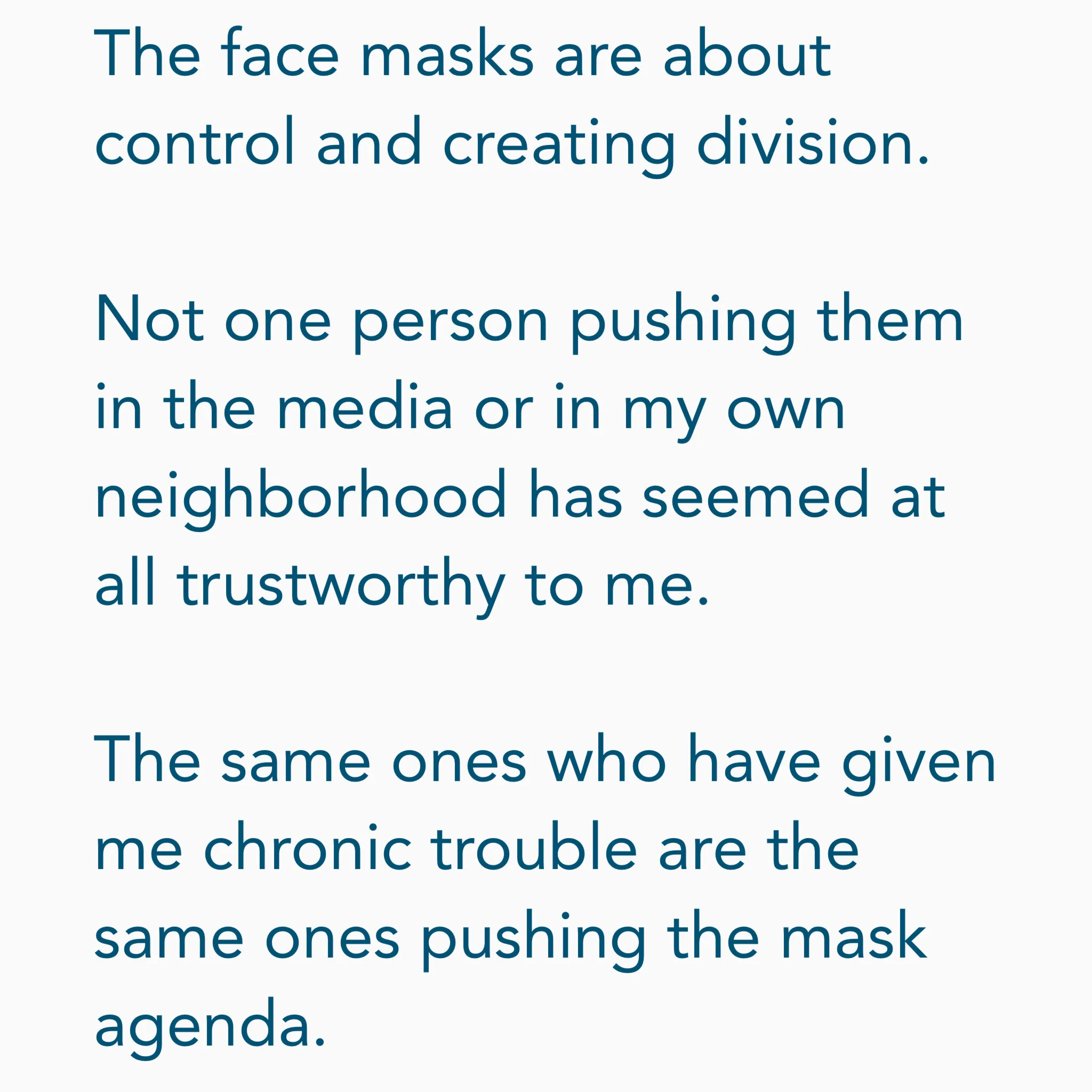 The same ones who have given me chronic trouble are the same ones pushing the mask agenda.