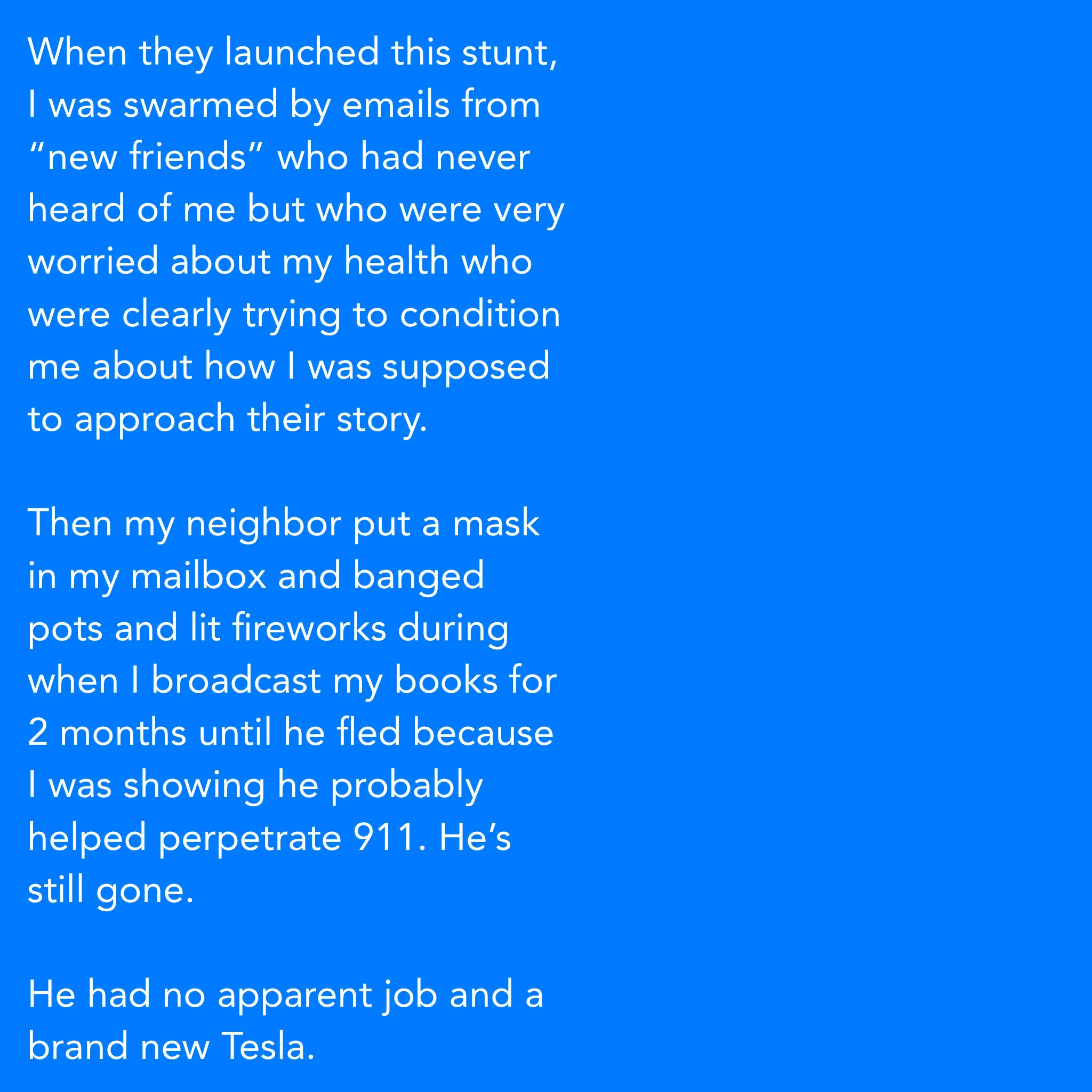 Then my neighbor put a mask in my mailbox and banged pots and lit fireworks during when I broadcast my books for 2 months until he fled because I was showing he probably helped perpetrate 911. He’s still gone.