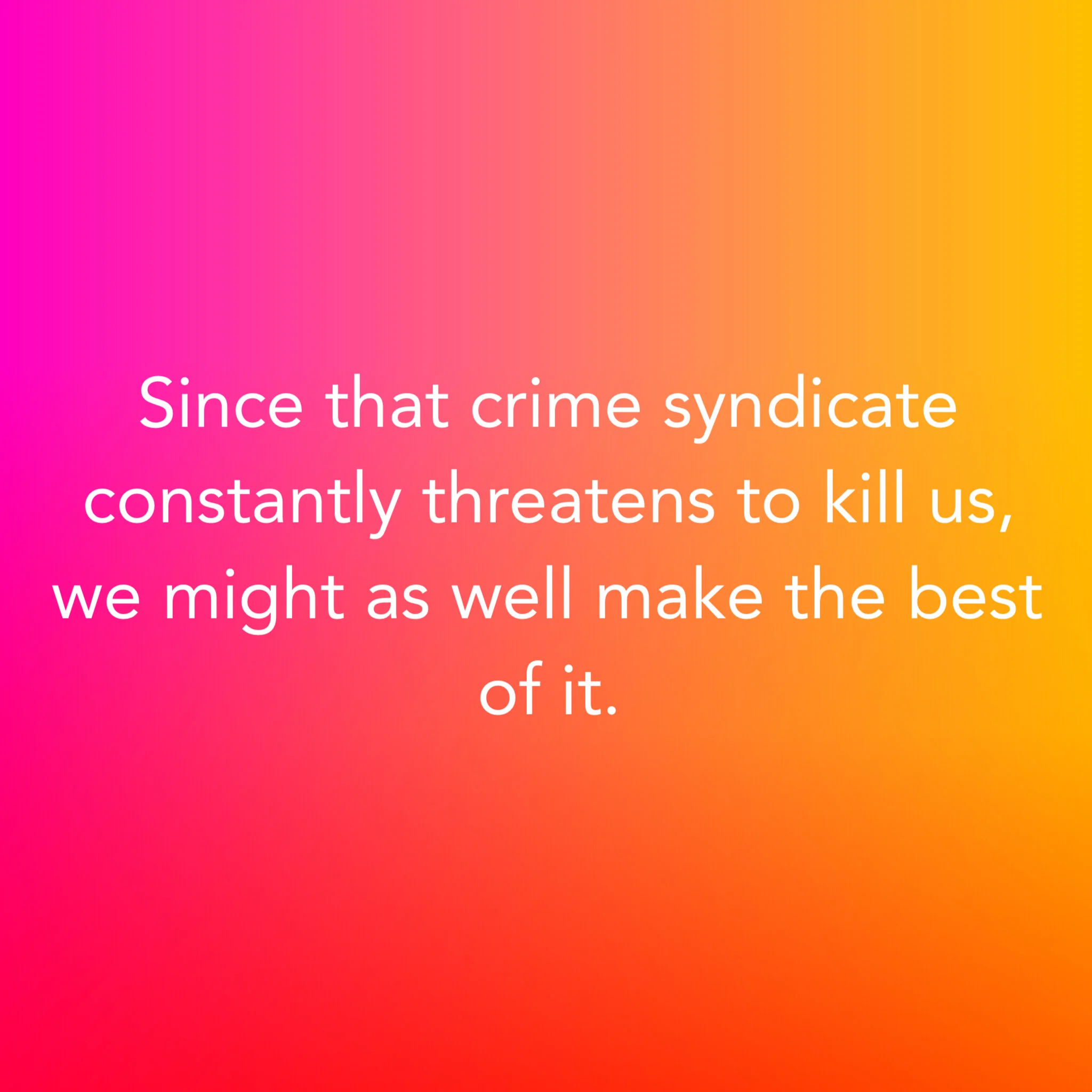 Since that crime syndicate constantly threatens to kill us, we might as well make the best of it.
