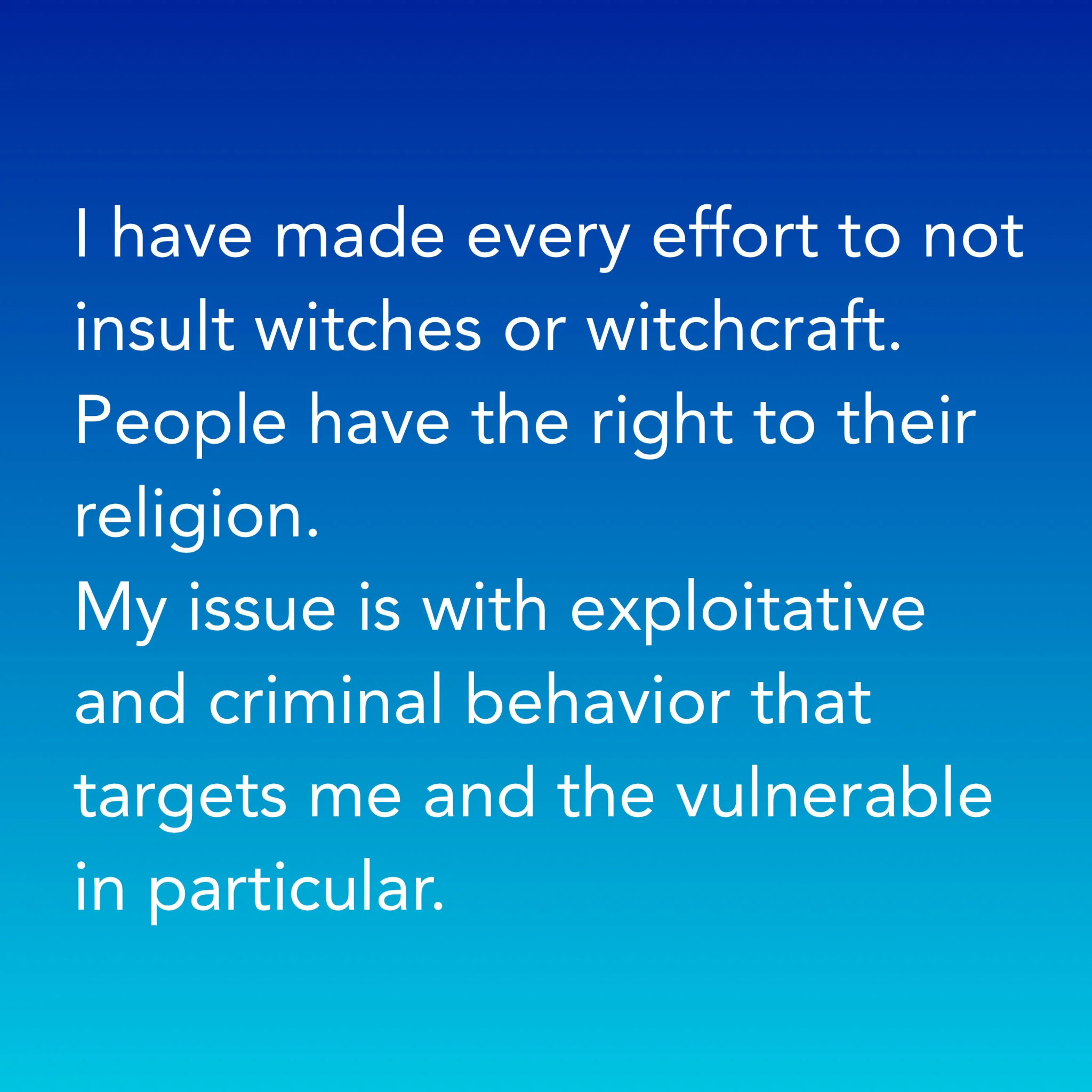 I have made every effort to not insult witches or witchcraft. People have the right to their religion. My issue is with exploitative and criminal behavior that targets me and the vulnerable in particular.