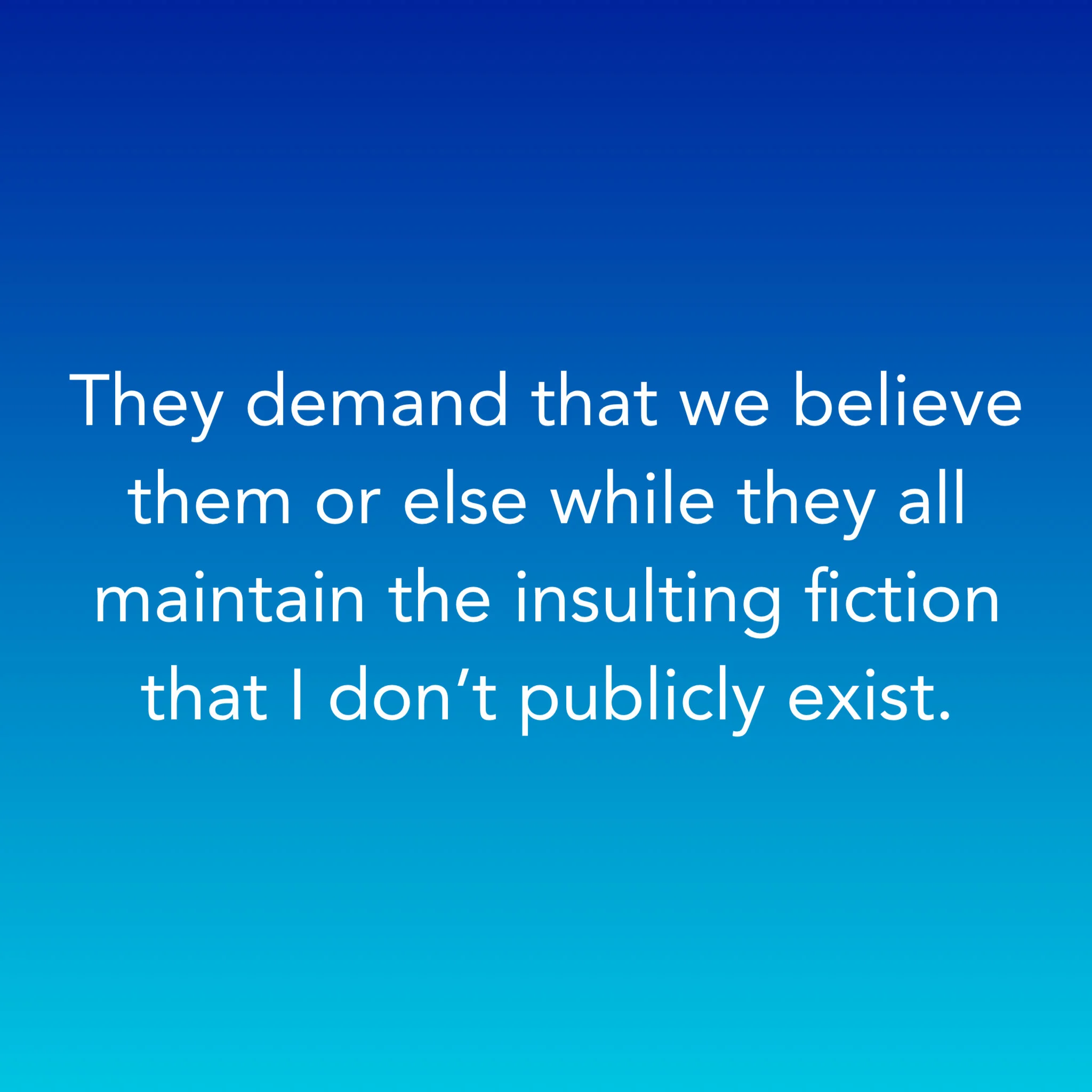 They demand that we believe them or else while they all maintain the insulting fiction that I don’t publicly exist.