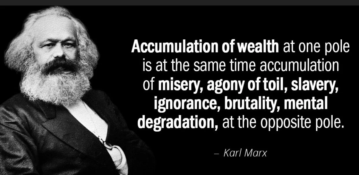 Accumulation of wealth at one pole is at the same time accumulation of misery, agony of toil, slavery, ignorance, brutality, mental degradation, at the opposite pole. Karl Marx