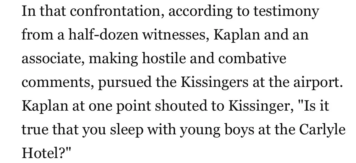In that confrontation, according to testimony from a half-dozen witnesses, Kaplan and an associate, making hostile and combative comments, pursued the Kissingers at the airport. Kaplan at one point shouted to Kissinger, "Is it true that you sleep with young boys at the Carlyle Hotel?"