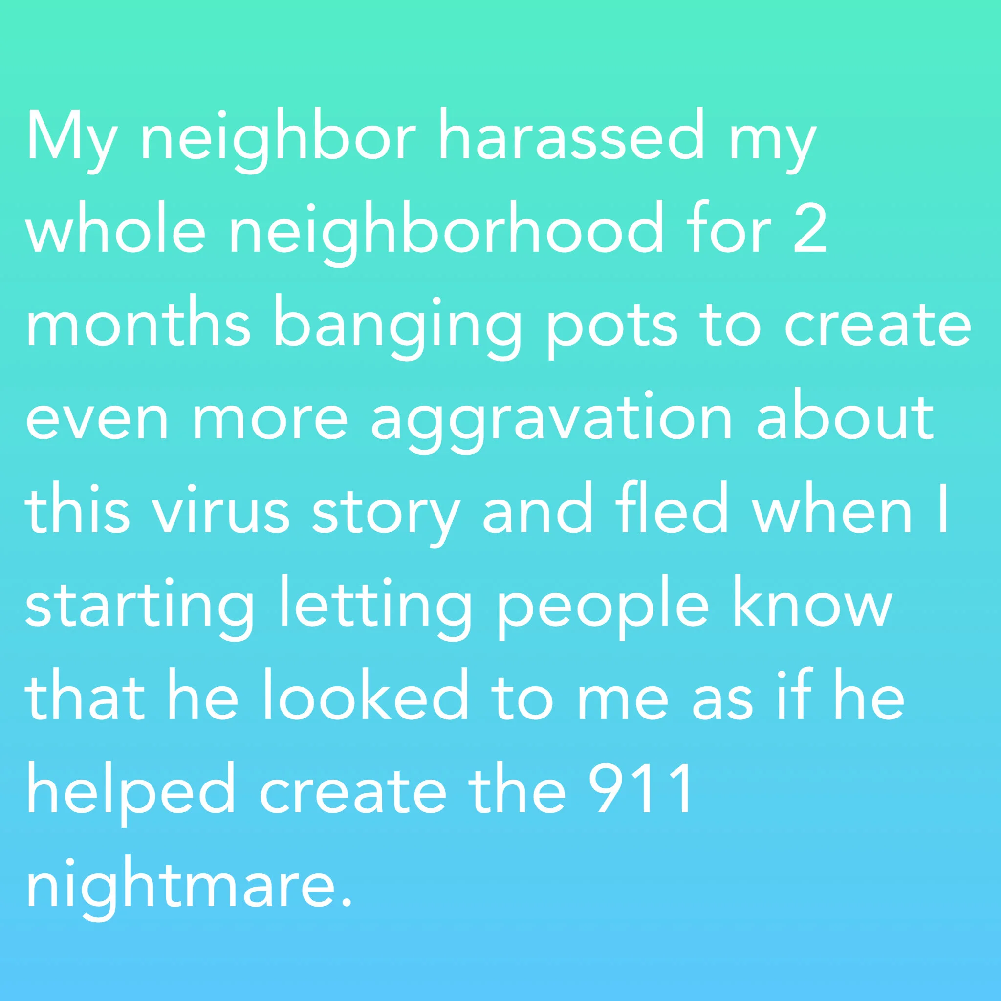 My neighbor harassed my whole neighborhood for 2 months banging pots to create even more aggravation about this virus story and fled when I starting letting people know that he looked to me as if he helped create the 911 nightmare.