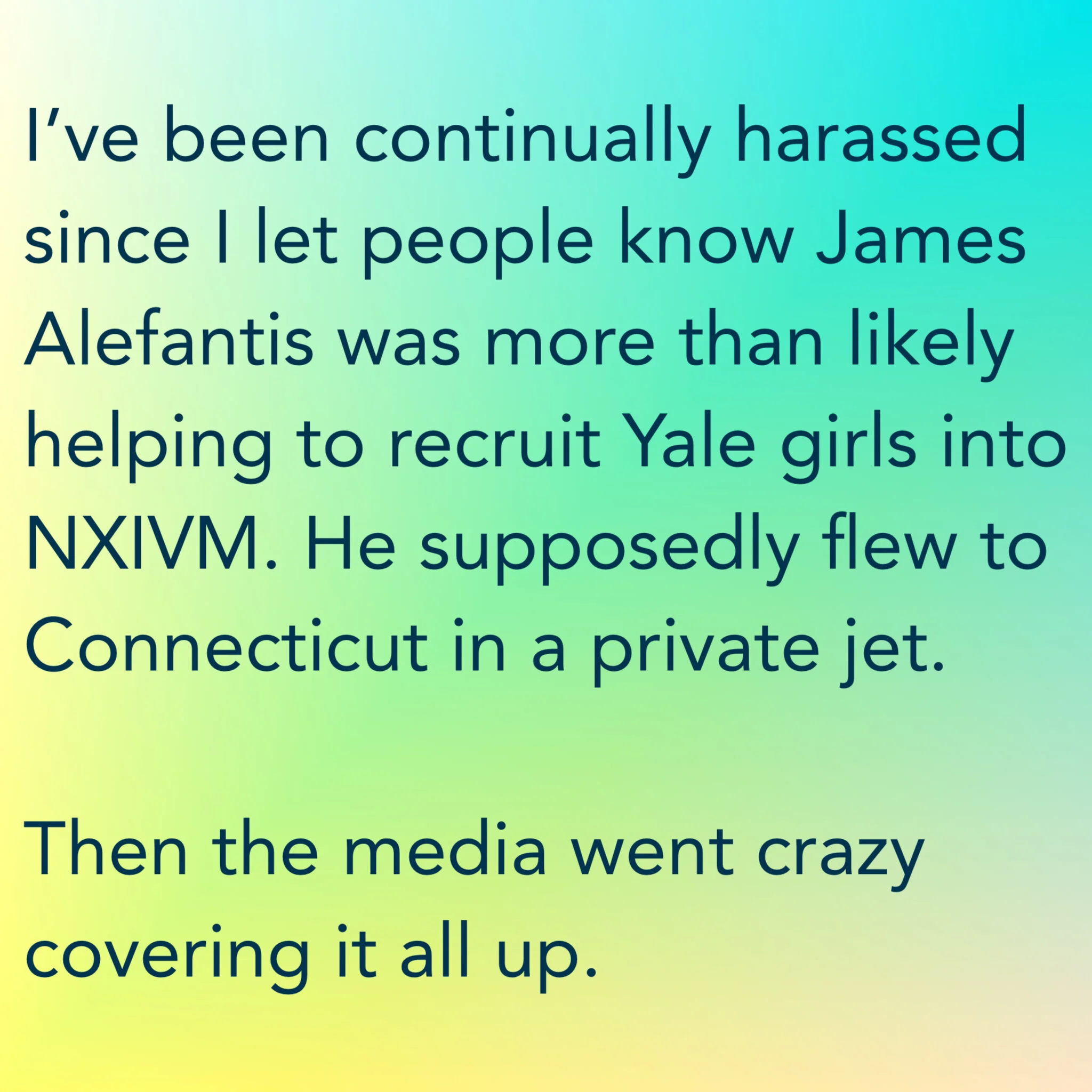 I’ve been continually harassed since I let people know James Alefantis was more than likely helping to recruit Yale girls into NXIVM. He supposedly flew to Connecticut in a private jet.