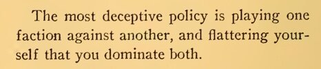Napoleon had a lot to teach us. April 8, 2021 The most deceptive policy is playing one faction against another, and flattering yourself that you dominate both. Learn from a great genius.