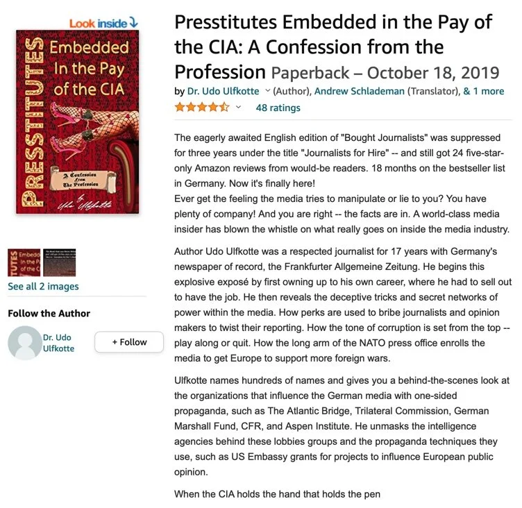 Now it's finally here! Ever get the feeling the media tries to manipulate or lie to you? You have plenty of company! And you are right -- the facts are in. A world-class media insider has blown the whistle on what really goes on inside the media industry. Author Udo Ulfkotte was a respected journalist for 17 years with Germany's newspaper of record, the Frankfurter Allgemeine Zeitung. He begins this explosive exposé by first owning up to his own career, where he had to sell out to have the job. He then reveals the deceptive tricks and secret networks of the power within the media. How perks are used to bribe journalists and opinion makers to twist their reporting. How the tone of corruption is set from the top -- play along or quit. How the long arm of the NATO press office enrolls the media to get Europe to support more foreign wars. Ulfkotte names hundreds of names and gives you a behind-the-scenes look at the organizations that influence the German media with one-sided propaganda, such as The Atlantic Bridge, Trilateral Commission, German Marshall Fund, CFR, and Aspen Institute. He unmasks the intelligence agencies behind these groups and the propaganda techniques they use, such as US Embassy grants for projects to influence European public opinion. When the CIA holds the hand that holds the pen.