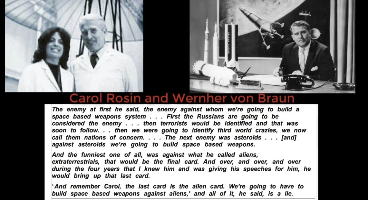 Operation Paperclip scientist Wernher von Braun’s former assistant Carol Rosin says that von Braun described the lies they were planning on telling us.