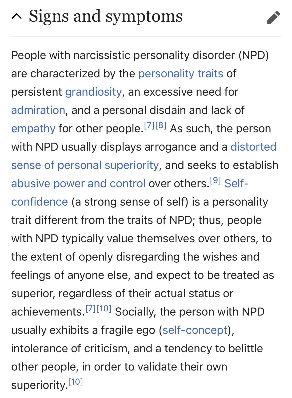 As such, the person with NPD usually displays arrogance and a distorted sense of personal superiority, and seeks to establish abusive power and control over others. Self- confidence (a strong sense of self) is a personality trait different from the traits of NPD; thus, people with NPD typically value themselves over others, to the extent of openly disregarding the wishes and feelings of anyone else, and expect to be treated as superior, regardless of their actual status or achievements. Socially, the person with NPD usually exhibits a fragile ego (self-concept), intolerance of criticism, and a tendency to belittle other people, in order to validate their own superiority.