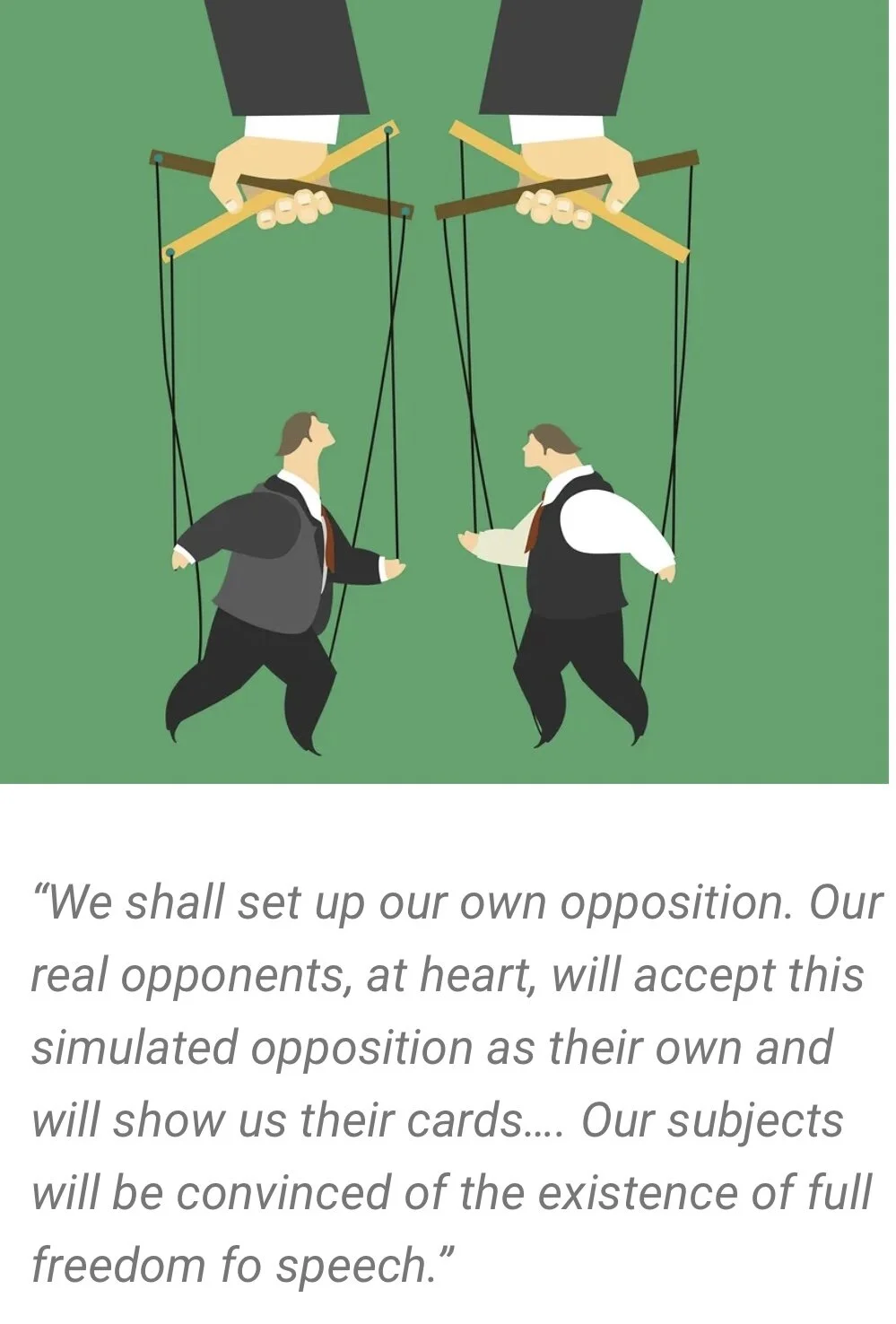 "We shall set up our own opposition. Our real opponents, at heart, will accept this simulated opposition as their own and will show us their cards.. Our subjects will be convinced of the existence of full freedom fo speech."