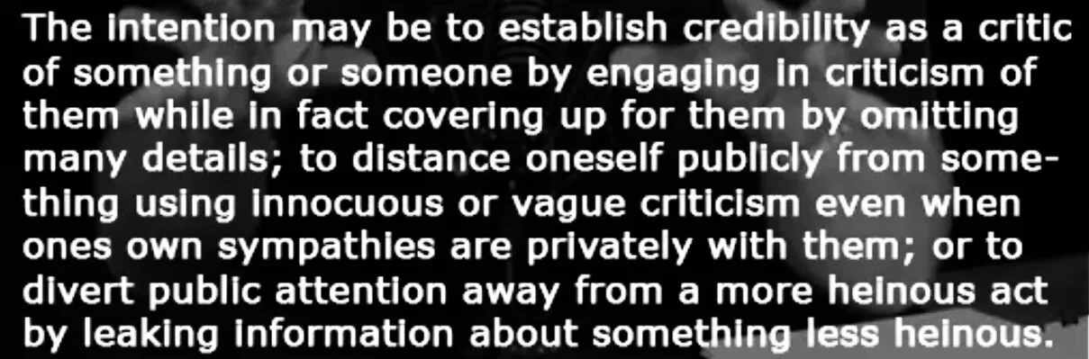The intention may be to establish credibility as a critic of something or someone by engaging in criticism of them while in fact covering up for them by omitting many details; to distance oneself publicly from something using innocuous or vague criticism even when ones own sympathies are privately with them; or to divert public attention away from a more heinous act by leaking information about something less heinous.