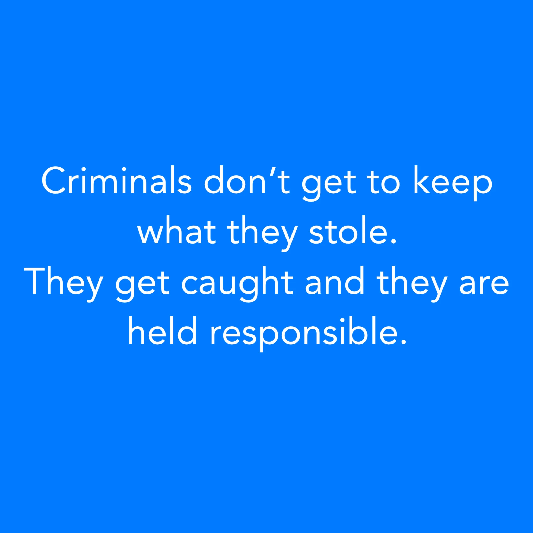 Criminals don’t get to keep what they stole. They get caught and they are held responsible.