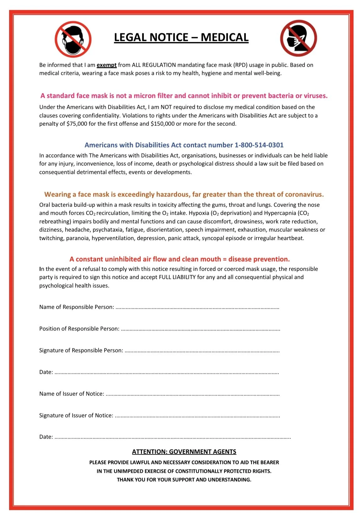 Be informed that I am exempt from ALL REGULATION mandating face mask (RPD) usage in public. Based on medical criteria, wearing a face mask poses a risk to my health, hygiene and mental well-being.