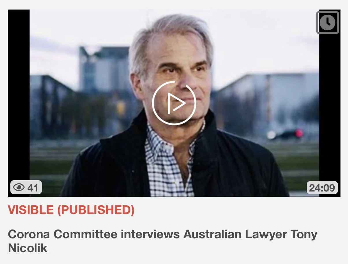 Corona Committee interviews Australian Lawyer Tony Nikolic. August 6, 2021 Lawyer Tony Nikolic says that Australians are finally becoming aware of the agenda that’s been hoisted on them. The link is here. The link is here. Learn more