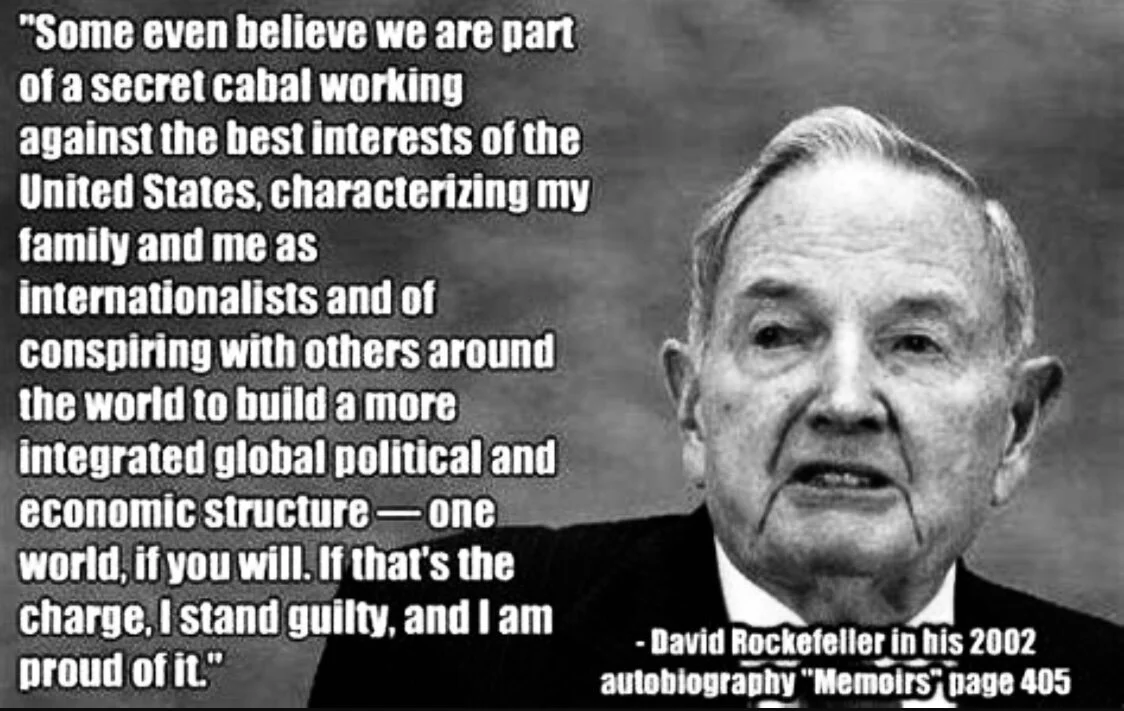 "Some even believe we are part of a secret cabal working against the best interests of the United States, characterizing my family and me as internationalists and of conspiring with others around the world to build a more integrated global political and economic structure-one world, if you will. If that's the charge, I stand guilty, and I am proud of it."