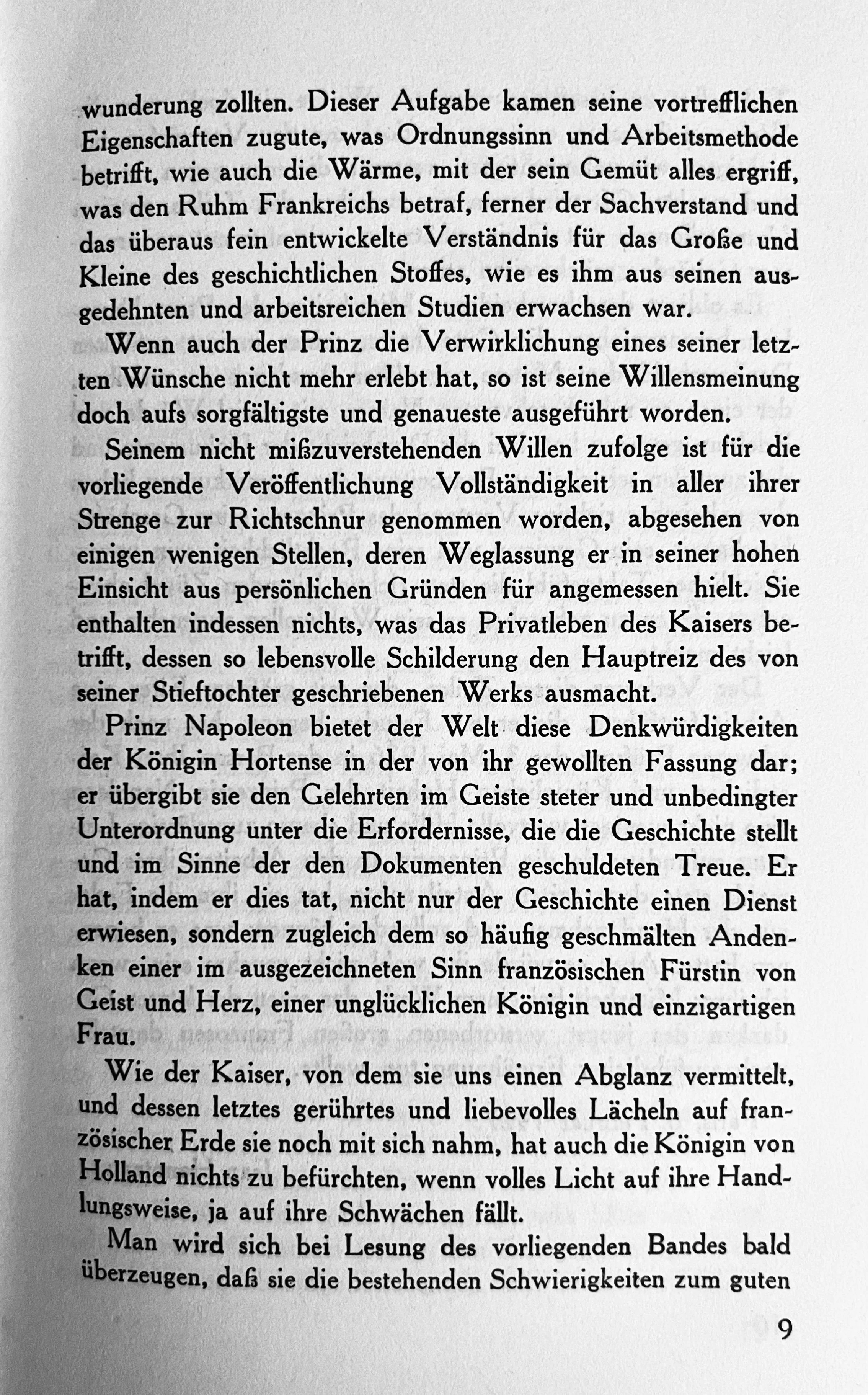 Prinz Napoleon bietet der Welt diese Denkwürdigkeiten der Königin Hortense in der von ihr gewollten Fassung dar; er übergibt sie den Gelehrten im Geiste steter und unbedingter Unterordnung unter die Erfordernisse, die die Geschichte stellt und im Sinne der den Dokumenten geschuldeten Treue. Er hat, indem er dies tat, nicht nur der Geschichte einen Dienst erwiesen, sondern zugleich dem so häufig geschmälten Andenken einer im ausgezeichneten Sinn französischen Fürstin von Geist und Herz, einer unglücklichen Königin und einzigartigen Frau.