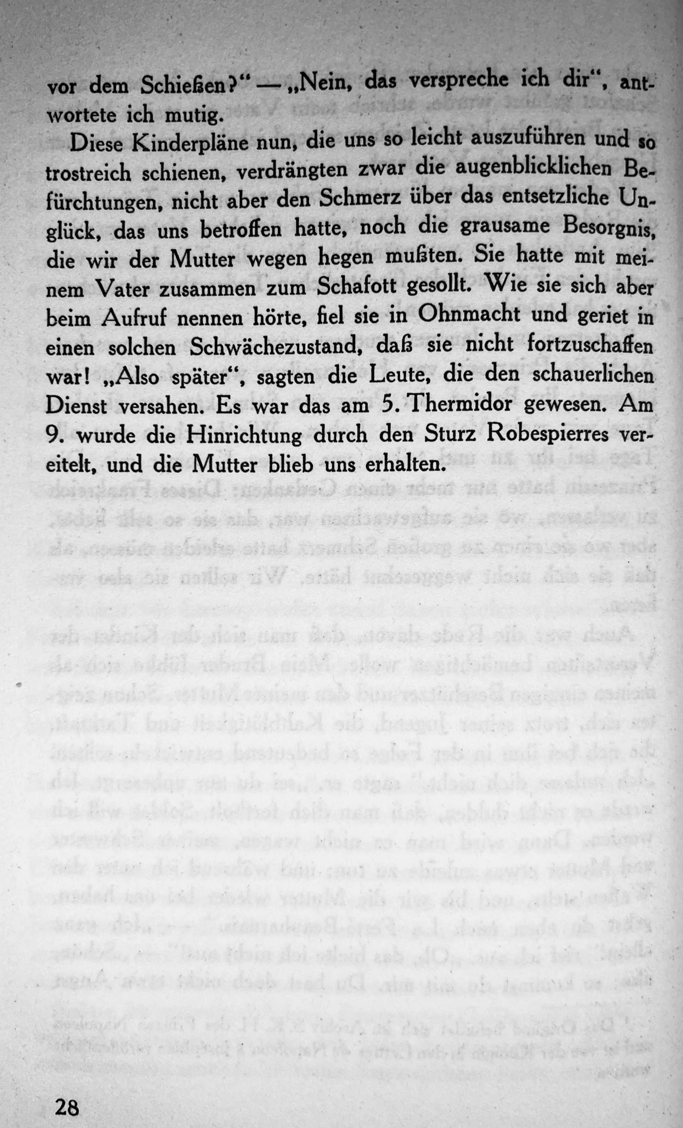 Diese Kinderpläne nun, die uns so leicht auszuführen und so trostreich schienen, verdrängten zwar die augenblicklichen Befürchtungen, nicht aber den Schmerz über das entsetzliche Unglück, das uns betroffen hatte, noch die grausame Besorgnis, die wir der Mutter wegen hegen muften. Sie hatte mit meinem Vater zusammen zum Schafott gesollt. Wie sie sich aber beim Aufruf nennen hörte, fiel sie in Ohnmacht und geriet in einen solchen Schwächezustand, da sie nicht fortzuschaffen war! „Also später", sagten die Leute, die den schauerlichen Dienst versahen. Es war das am 5. Thermidor gewesen. Am 9. wurde die Hinrichtung durch den Sturz Robespierres vereitelt, und die Mutter blieb uns erhalten.
