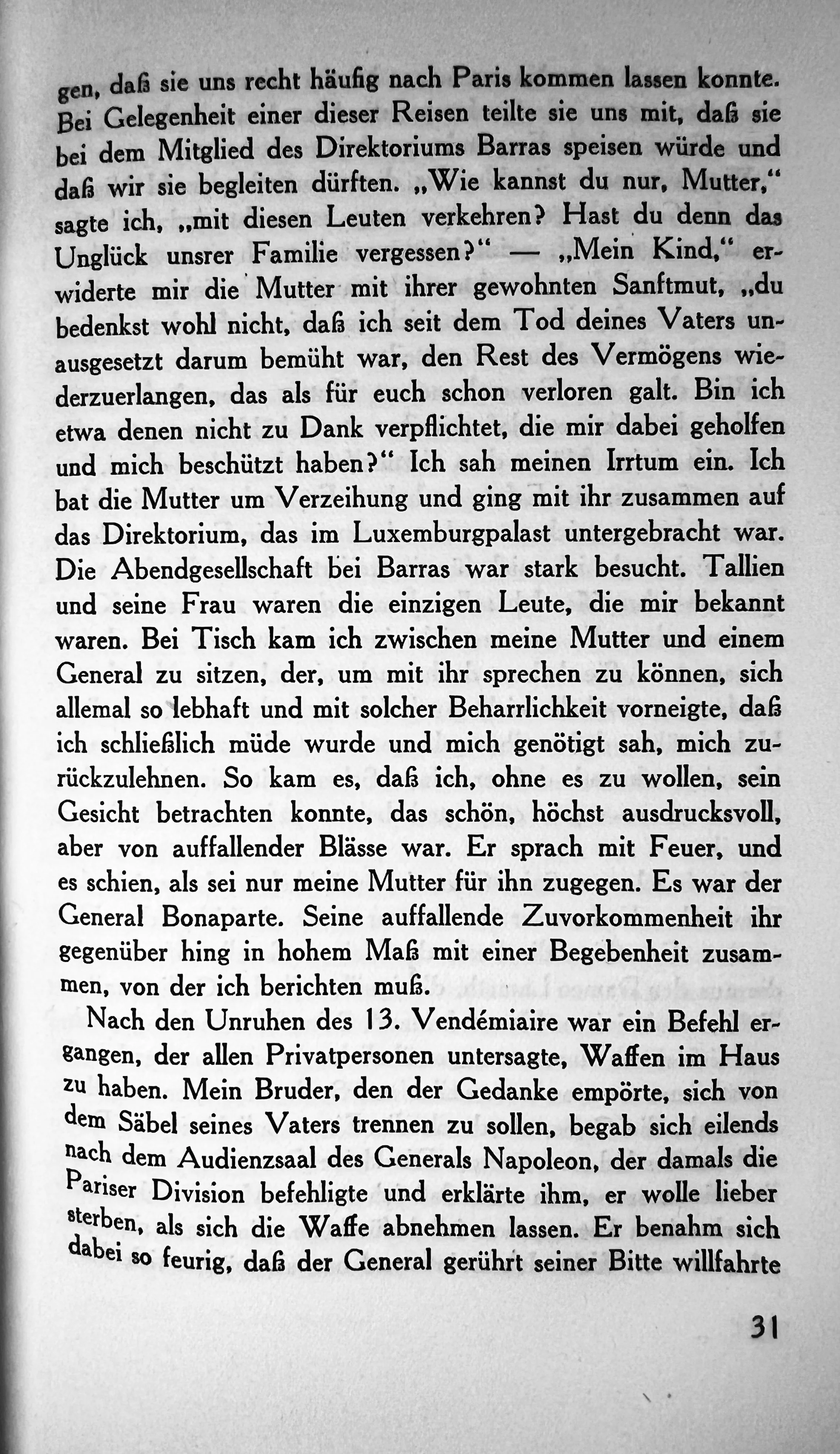 Bei Gelegenheit einer dieser Reisen teilte sie uns mit, das sie bei dem Mitglied des Direktoriums Barras speisen würde und das wir sie begleiten dürften. „Wie kannst du nur, Mutter“, sagte ich, „mit diesen Leuten verkehren Hast du denn das Unglück unsrer Familie vergessen?" -„Mein Kind," erwiderte mir die Mutter mit ihrer gewohnten Sanftmut, „du bedenkst wohl nicht, das ich seit dem Tod deines Vaters unausgesetzt darum bemüht war, den Rest des Vermögens wiederzuerlangen, das als für euch schon verloren galt. Bin ich etwa denen nicht zu Dank verpflichtet, die mir dabei geholfen und mich beschützt haben?" Ich sah meinen Irrtum ein. Ich bat die Mutter um Verzeihung und ging mit ihr zusammen auf das Direktorium, das im Luxemburgpalast untergebracht war.