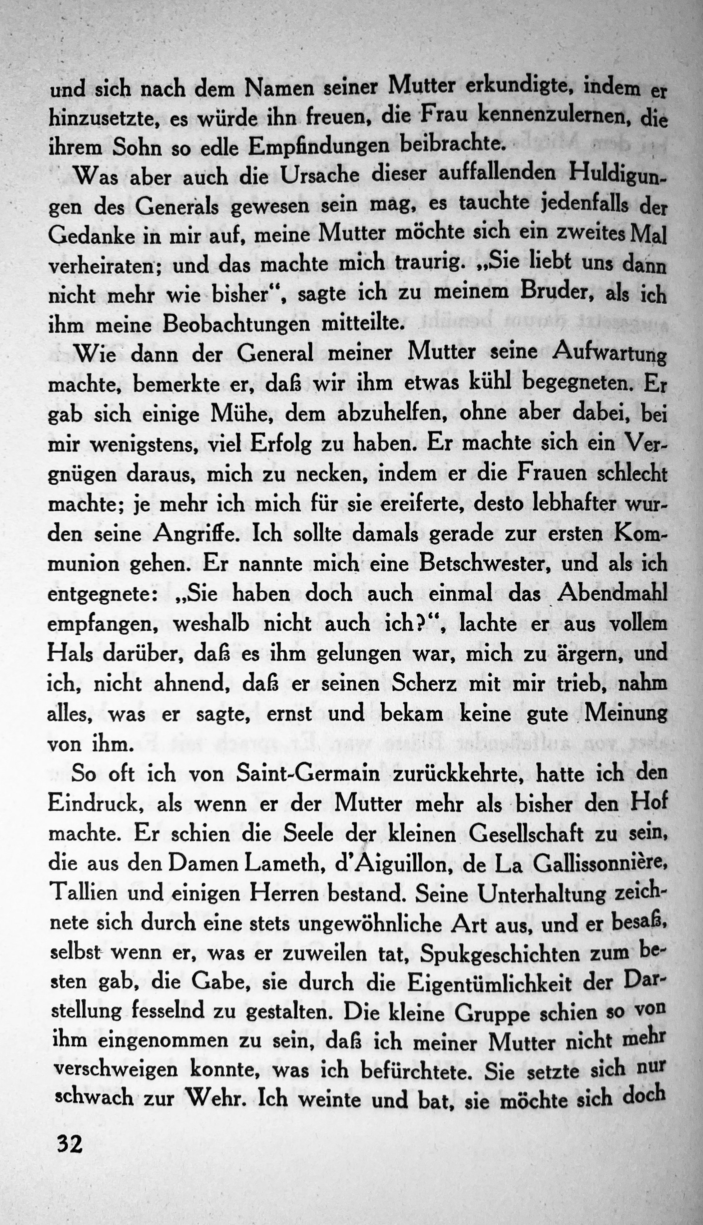 So oft ich von Saint-Germain zurückkehrte, hatte ich den Eindruck, als wenn er der Mutter mehr als bisher den Hof machte. Er schien die Seele der kleinen Gesellschaft zu sein, die aus den Damen Lameth, d’Aiguillon, de La Gallissonnière, Tallien und einigen Herren bestand. Seine Unterhaltung zeichnete sich durch eine stets ungewöhnliche Art aus, und er besaß, selbst wenn er, was er zuweilen tat, Spukgeschichten zum besten gab, die Gabe, sie durch die Eigentümlichkeit der Darstellung fesselnd zu gestalten. Die kleine Gruppe schien so von ihm eingenommen zu sein, das ich meiner Mutter nicht mehr verschweigen konnte, was ich befürchtete. Sie setzte sich nur schwach zur Wehr. Ich weinte und bat, sie möchte sich doch nicht wider verheiraten, jedenfalls nicht mit einem Mann, dessen Stellung sie von uns entfernen musste. Aber der General galt berets mehr als ich. Und doch weiß ich, das mein Kummer meiner Mutter lange Zeit Zweifel verursacht hat. Sie leistete aber keinen Widerstand mehr, wie sie ihn zur Abreise beret sah.