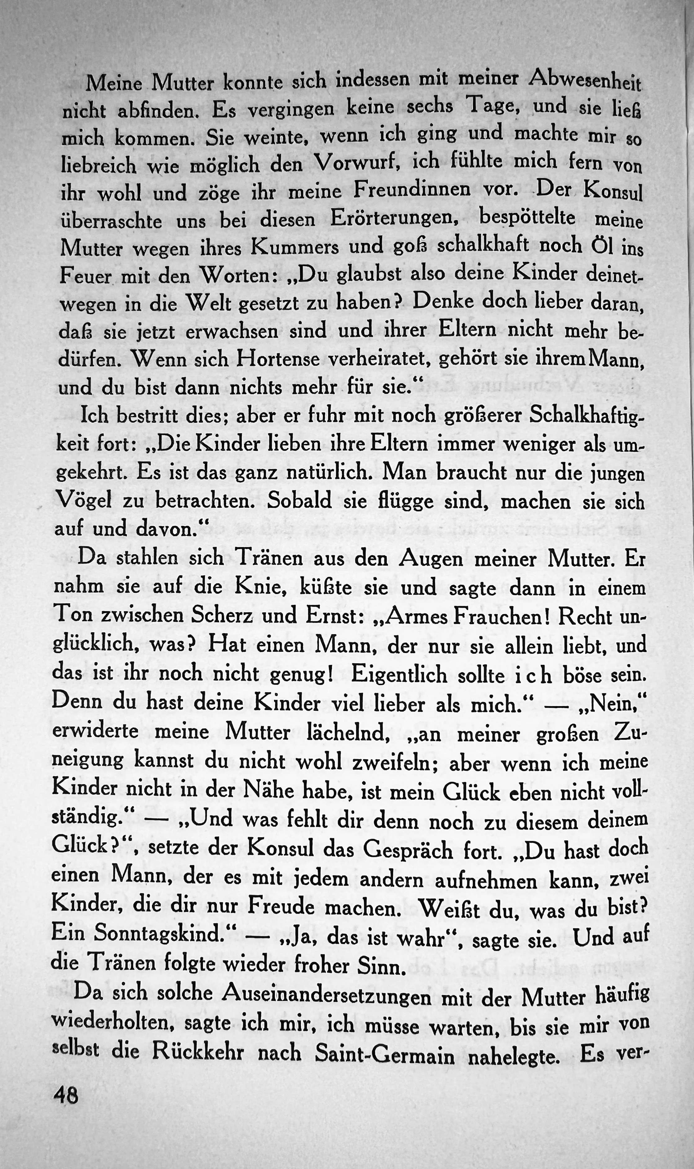 Da stahlen sich Tränen aus den Augen meiner Mutter. Er nahm sie auf die Knie, küßte sie und sagte dann in einem Ton zwischen Scherz und Ernst: „Armes Frauchen! Recht unglücklich, was? Hat einen Mann, der nur sie allein liebt, und das ist ibr noch nicht genug! Eigentlich sollte ich böse sein. Den du hast deine Kinder viel lieber als mich." - „Nein,“ erwiderte meine Mutter lächelnd, „an meiner großen Zuneigung kannst du nicht wohl zweifeln; aber wenn ich meine Kinder nicht in der Nähe habe, ist mein Glück eben nicht vollständig." - „Und was felt dir denn noch zu diesem deinem Glück?", setzte der Konsul das Gespräch fort. „Du hast doch einen Mann, der es mit jedem andern aufnehmen kann, zwei Kinder, die dir nur Freude machen. Weißt du, was du bist? Ein Sonntagskind." - „Ja, das ist wahr", sagte sie. Und auf die Tränen folgte wider froher Sinn.