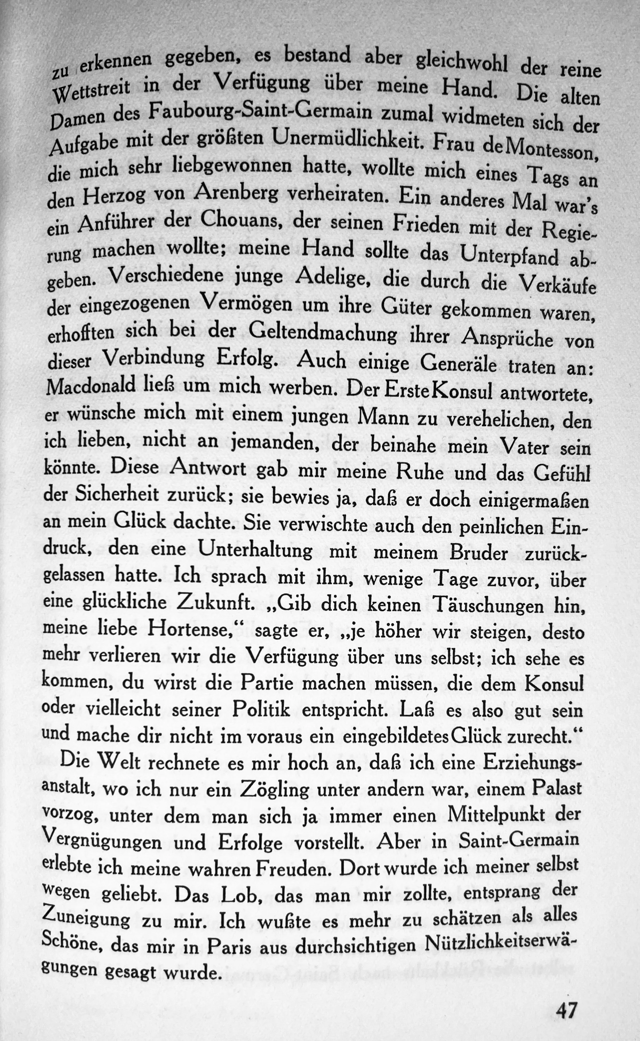Ich hatte zwar meine Abneigung gegen bloße Vernunftehen zu erkennen gegeben, es bestand aber gleichwohl der reine Wettstreit in der Verfügung über meine Hand. Die alten Damen de Faubourg-Saint-Germain zumal widmeten sich der Aufgabe mit der größten Unermüdlichkeit. Frau de Montesson, die mich sehr liebgewonnen hatte, wollte mich eines Tags an den Herzog von Arenberg verheiraten. Ein anderes Mal war's ein Anführer der Chouans, der seinen Frieden mit der Regierung machen wollte; meine Hand sollte das Unterpfand abgeben. Verschiedene junge Adelige, die durch die Verkäufe der eingezogenen Vermögen um ire Güter gekommen waren, erhofften sich bei der Geltendmachung ihrer Ansprüche von dieser Verbindung Erfolg. Auch einige Generäle traten an: Macdonald liess um mich werben. Der Erste Konsul antwortete, er wünsche mich mit einem jungen Mann zu verehelichen, den ich lieben, nicht an jemanden, der beinahe mein Vater sein könnte. Diese Antwort gab mir meine Rue und das Gefühl der Sicherheit zurück; sie bewies ja, daß er doch einigermaßen an mein Glück dachte. Sie verwischte auch den peinlichen Eindruck, den eine Unterhaltung mit meinem Bruder zurückgelassen hatte. Ich sprach mit ihm, wenige Tage zuvor, über eine glückliche Zukunft. „Gib dich keinen Täuschungen hin, meine liebe Hortense,“ sagte er, „je höher wir steigen, desto mehr verlieren wir die Verfügung über uns selbst; ich she es kommen, du wirst die Partie machen müssen, die dem Konsul oder vielleicht seiner Politik entspricht. Las es also gut sein und mache dir nicht im voraus ein eingebildetes Glück zurecht."