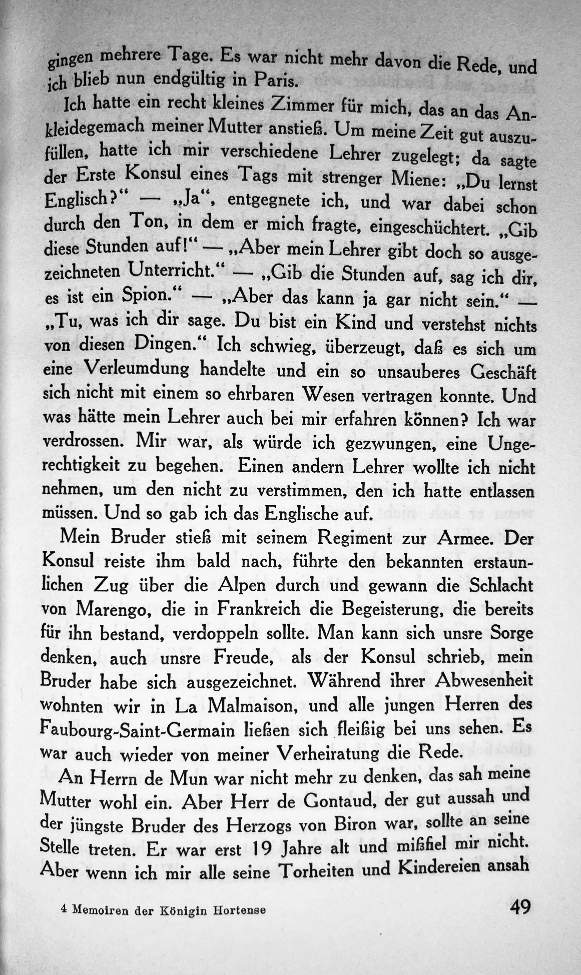 Ich hatte ein recht kleines Zimmer für mich, das an das Ankleidegemach meiner Mutter anstieß. Um meine Zeit gut auszufüllen, hatte ich mir verschiedene Lehrer zugelest; da sagte der Erste Konsul eines Tags mit strenger Miene: „Du lernst Englisch?" - „Ja“, entgegnete ich, und war dabei schon durch den Ton, in dem er mich fragte, eingeschüchtert. „Gib diese Stunden auf!", Aber mein Lehrer git doch so ausgezeichneten Unterricht." - „Gib die Stunden auf, sag ich dir, es ist ein Spion." - „Aber das kann ja gar nicht sein." - „Tu, was ich dir sage. Du bist ein Kind und verstehst nichts von diesen Dingen.“ Ich schwieg, überzeugt, das es sich um eine Verleumdung handelte und ein so unsauberes Geschäft sich nicht mit einem so ehrbaren Wesen vertragen konnte. Und was hätte mein Lehrer auch bei mir erfahren können? Ich war verdrossen. Mir war, als würde ich gezwungen, eine Ungerechtigkeit zu begehen. Einen andern Lehrer wollte ich nicht nehmen, um den nicht zu verstimmen, den ich hatte entlassen müssen. Und so gab ich das Englische auf.