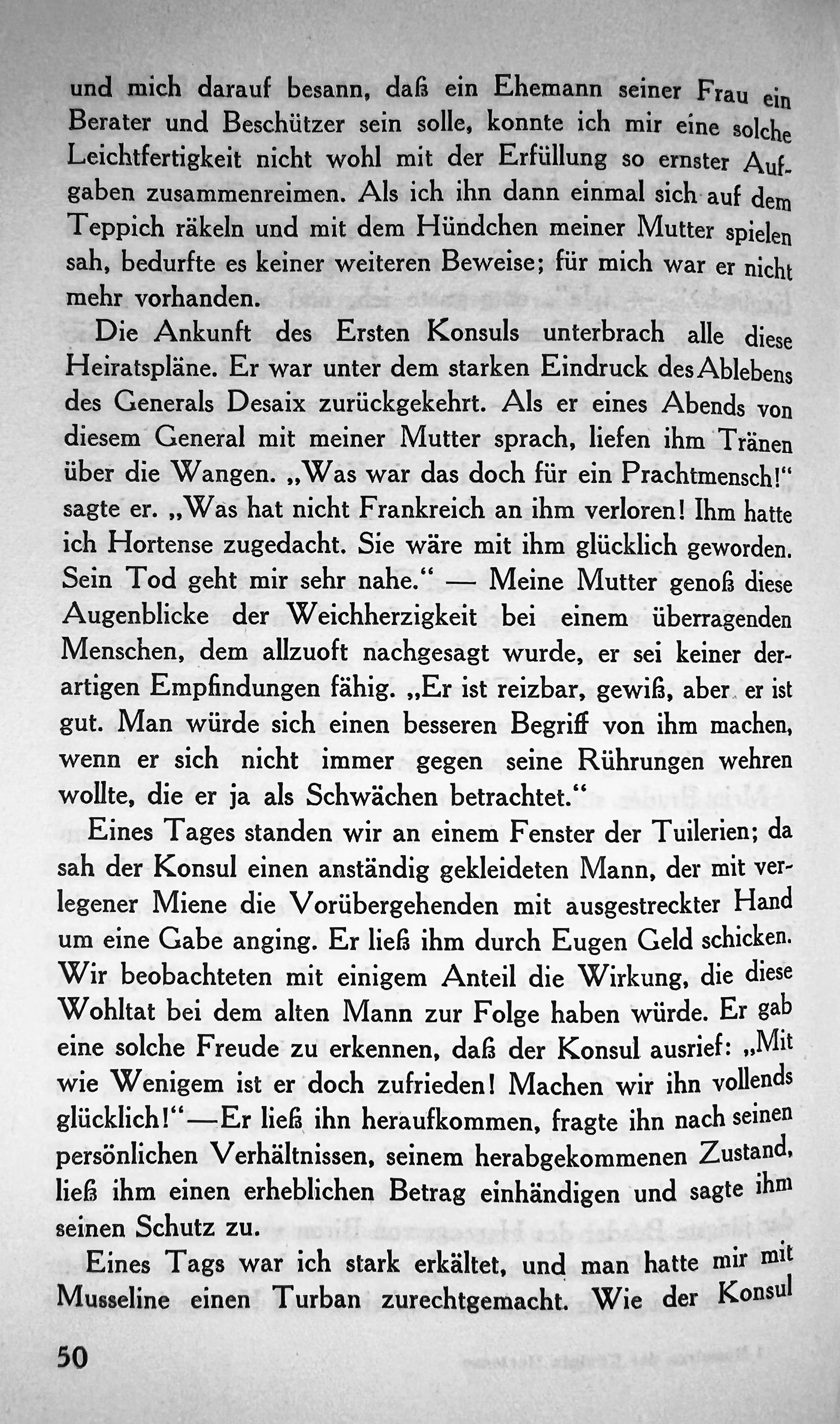 Die Ankunft des Ersten Konsuls unterbrach alle diese Heiratspläne. Er war unter dem starken Eindruck des Ablebens des Generals Desaix zurückgekehrt. Als er eines Abends von diesem General mit meiner Mutter sprach, liefen ihm Tränen über die Wangen. ,,Was war das doch für ein Prachtmensch!" sagte er. „Was hat nicht Frankreich an ihm verloren! Ihm hatte ich Hortense zugedacht. Sie wäre mit ihm glücklich geworden. Sein Tod get mir sehr nahe.“ - Meine Mutter genoss diese Augenblicke der Weichherzigkeit bei einem überragenden Menschen, dem allzuoft nachgesagt wurde, er sei keiner derartigen Empfindungen fähig. „Er ist reizbar, gewiss, aber er ist gut. Man würde sich einen besseren Begrif von ihm machen, wenn er sich nicht immer gegen seine Rührungen wehren wollte, die er ja als Schwächen betrachtet.