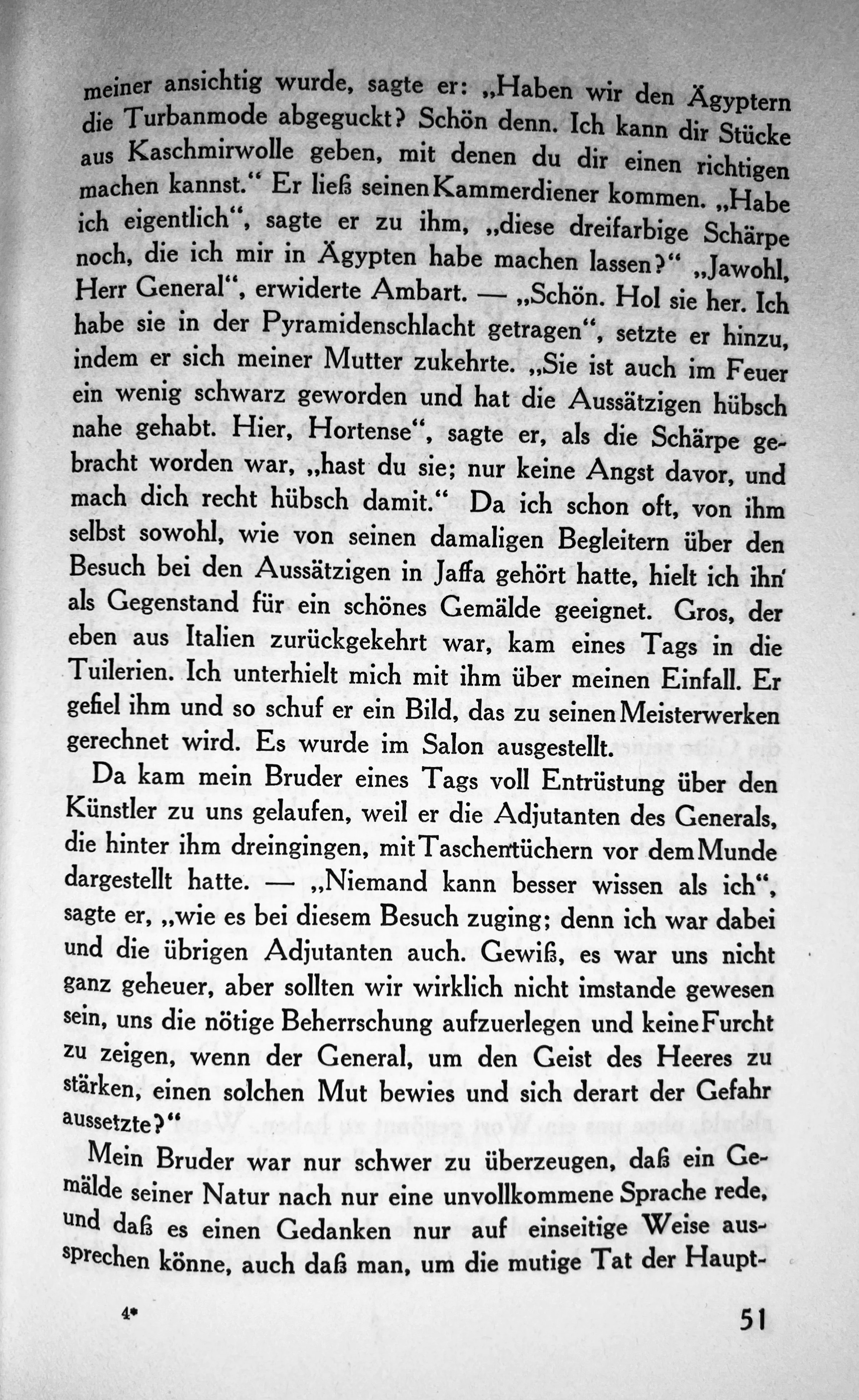 Eines Tags war ich stark erkältet, und man hatte mir mit Musseline einen Turban zurechtgemacht. Wie der Konsul meiner ansichtig wurde, sagte er: Haben wir den Ägyptern die Turbanmode abgeguckt? Schön denn. Ich kann dir Stücke aus Kaschmirwolle geben, mit denen du dir einen richtigen machen kannst.“ Er liess seinen Kammerdiener kommen. „Habe ich eigentlich", sagte er zu ihm, „diese dreifarbige Schärpe noch, die ich mir in Ägypten habe machen lassen?" „Jawohl, Herr General", erwiderte Ambart. - „Schön. Hol sie her. Ich habe sie in der Pyramidenschlacht getragen“, setzte er hinzu, indem er sich meiner Mutter zukehrte. „Sie ist auch im Feuer ein wenig schwarz geworden und hat die Aussätzigen hübsch nahe gehabt. Hier, Hortense", sagte er, als die Schärpe gebracht worden war, „hast du sie; nur keine Angst davor, und mach dich recht hübsch damit."