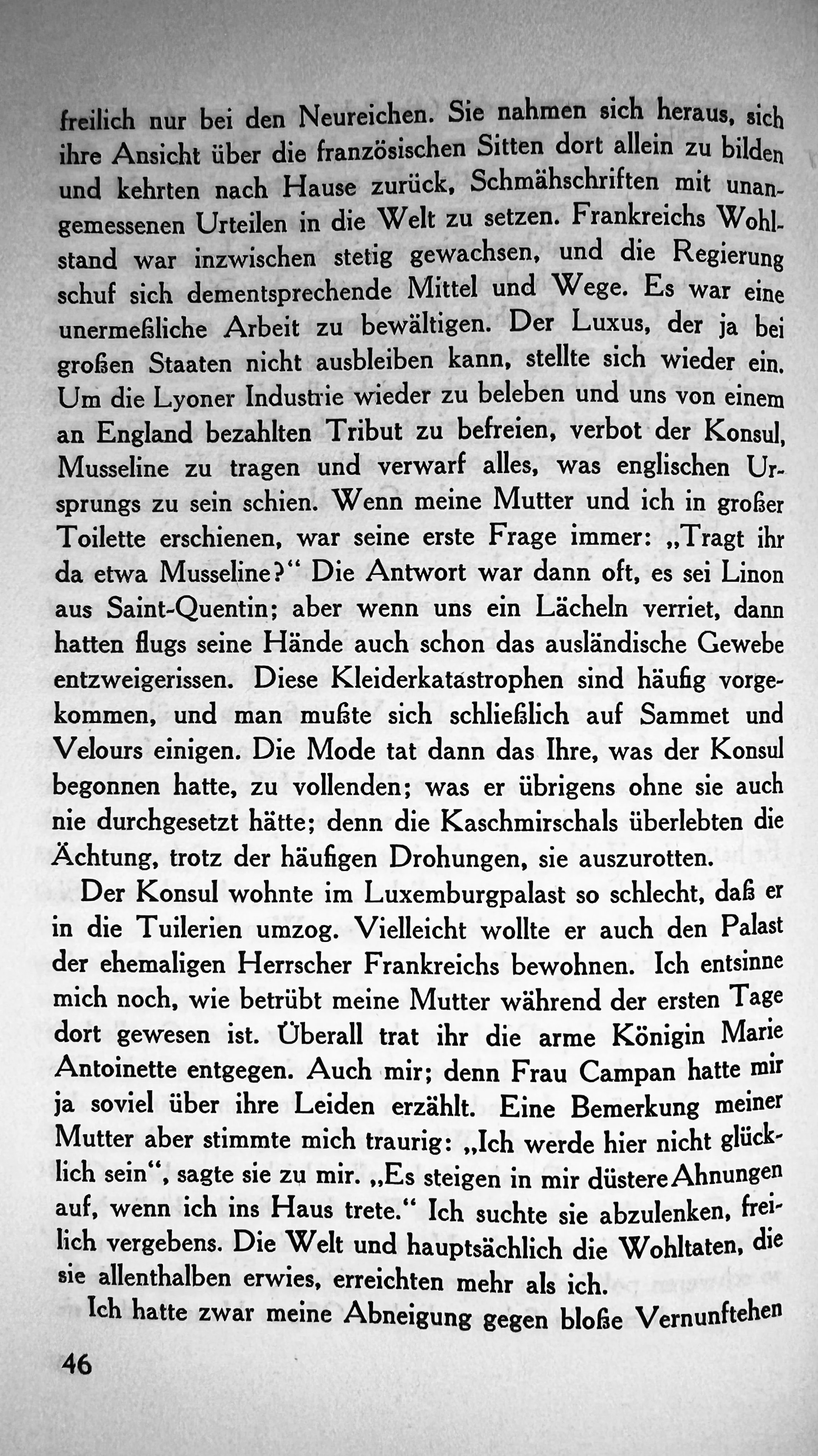 Um die Lyoner Industrie wieder zu beleben und uns von einem an England bezahlten Tribut zu befreien, verbot der Konsul Musseline zu tragen und verwarf alles, was englischen Ursprungs zu sein schien. Wenn meine Mutter und ich in großer Toilette erschienen, war seine erste Frage immer: „Tragt ihr da etwa Musseline?" Die Antwort war dann oft, es sei Linon aus Saint-Quentin; aber wen uns ein Lächeln verriet, dann hatten flugs seine Hände auch schon das ausländische Gewebe entzweigerissen. Diese Kleiderkatastrophen sind häufig vorgekommen, und man musste sich schließlich auf Sammet und Velours einigen. Die Mode tat dann das Ihre, was der Konsul begonnen hatte, zu vollenden; was er übrigens ohne sie auch nie durchgesetzt hätte; denn die Kaschmirschals überlebten die Ächtung, trotz der häufigen Drohungen, sie auszurotten.