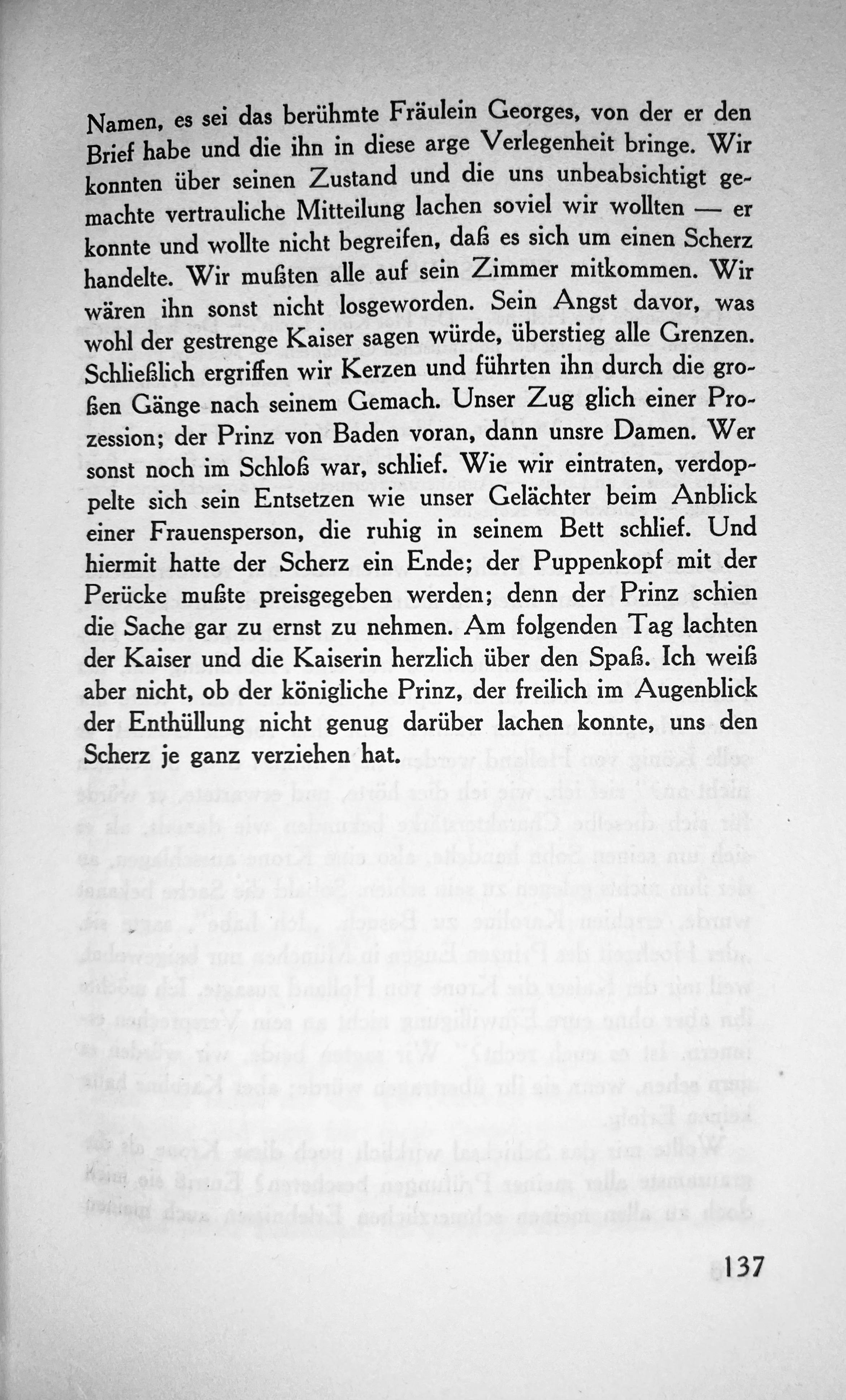 Schliesslich ergriffen wir Kerzen und führten in durch die grossen Gänge nach seinem Gemach. Unser Zug glich einer Prozession; der Prinz von Baden voran, dann unsre Damen. Wer sonst noch im Schloss war, schlief. Wie wir eintraten, verdoppelte sich sein Entsetzen wie unser Gelächter beim Anblick einer Frauensperson, die ruhig in seinem Bett schlief. Und hiermit hatte der Scherz ein Ende; der Puppenkopf mit der Perücke mufte preisgegeben werden; denn der Prinz schien die Sache gar zu ernst zu nehmen. Am folgenden Tag lachten der Kaiser und die Kaiserin herzlich über den Spa. Ich weiss aber nicht, ob der königliche Prinz, der freilich im Augenblick der Enthüllung nicht genug darüber lachen konnte, uns den Scherz je ganz verziehen hat.