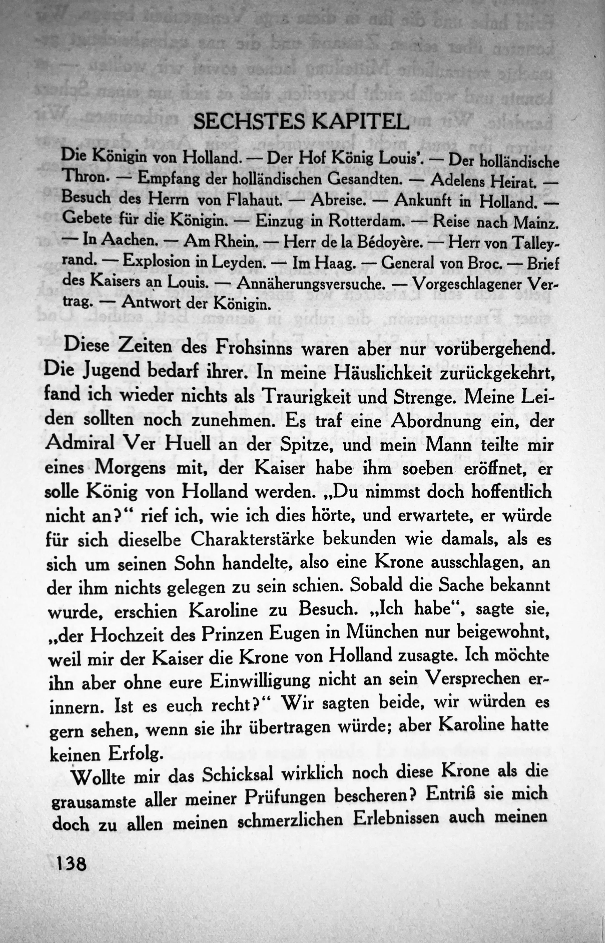 Der Prinz von Bayern besuchte mich gleichzeitig mit den holländischen Abgeordneten. Mein Schmerz, der wider meinen Willen zum Durchbruch kam, überraschte ihn sehr und brachte die Holländer auf den Gedanken, ich könnte ihr Land nicht leiden. Der Kaiser brauchte für seine Zwecke auch den Ehrgeiz seiner Brüder. Er war bereit, seiner Familie die Unzufriedenheiten zu vergeben, die dem Verlangen nach Macht und Größe entsprangen; war es ihm doch vertrauter als irgend jemandem. Und er konnte es mir deshalb auch nicht verzeihen, das ich so ganz ausser mir war, wie man mir eine Krone bescherte. ,, Wie?", sagte er zu mir, „solltest du deiner hohen Stellung nicht gewachsen sein? Geh, regiere, beglücke deine Völker, eine Genugtuung, die gewiss nach deinem Herzen ist! Ich habe für dich eine Einrichtung getroffen, die in keinem