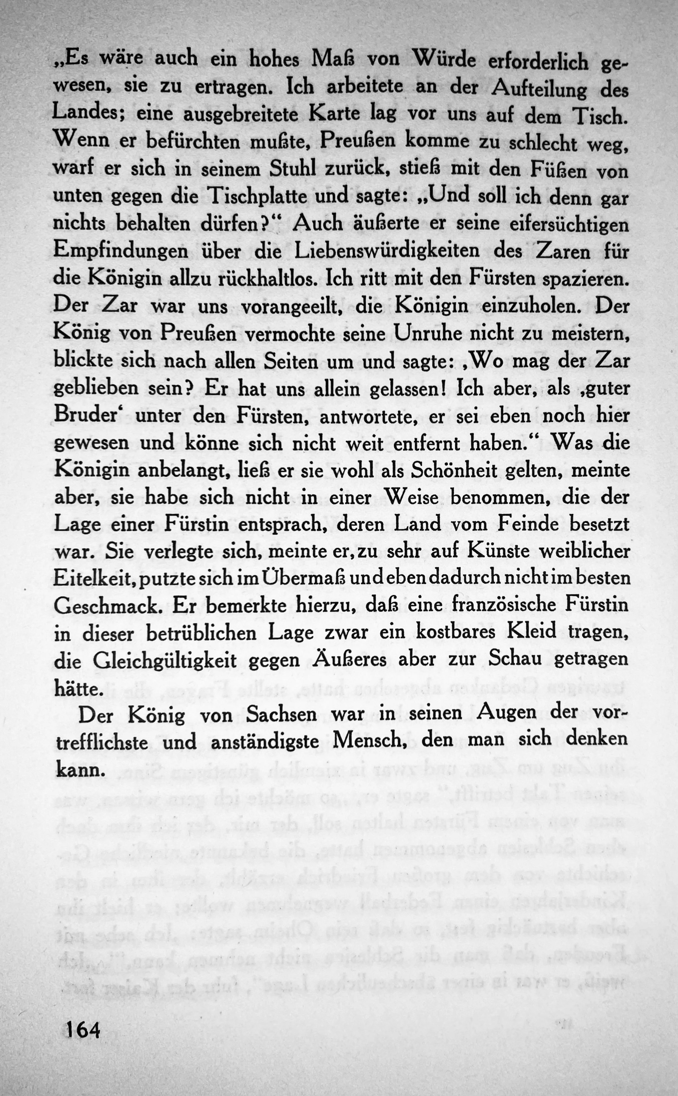 Der Zar war uns vorangeeilt, die Königin einzuholen. Der König von Preußen vermochte seine Unruhe nicht zu meistern, blickte sich nach allen Seiten um und sagte: ,Wo mag der Zar geblieben sein? Er hat uns allein gelassen! Ich aber, als, guter Bruder' unter den Fürsten, antwortete, er sei eben noch hier gewesen und könne sich nicht weit entfernt haben." Was die Königin anbelangt, ließ er sie wohl als Schönheit gelten, meinte aber, sie habe sich nicht in einer Weise benommen, die der Lage einer Fürstin entsprach, deren Land vom Feinde besetzt war. Sie verlegte sich, meinte er, zu sehr auf Künste weiblicher Eitelkeit, putzte sich im Übermaß un eben dadurch nicht im besten Geschmack. Er bemerkte hierzu, da eine französische Fürstin in dieser betrüblichen Lage zwar ein kostbares Kleid tragen, die Gleichgültigkeit gegen Äußeres aber zur Schau getragen hätte.