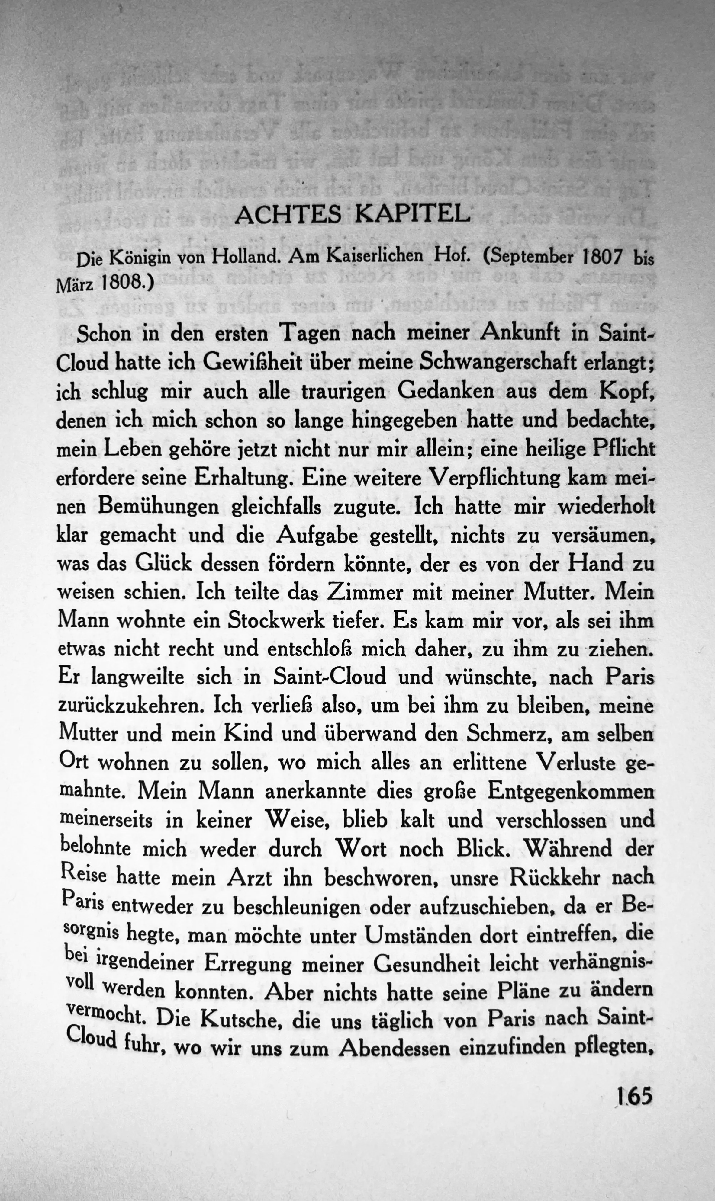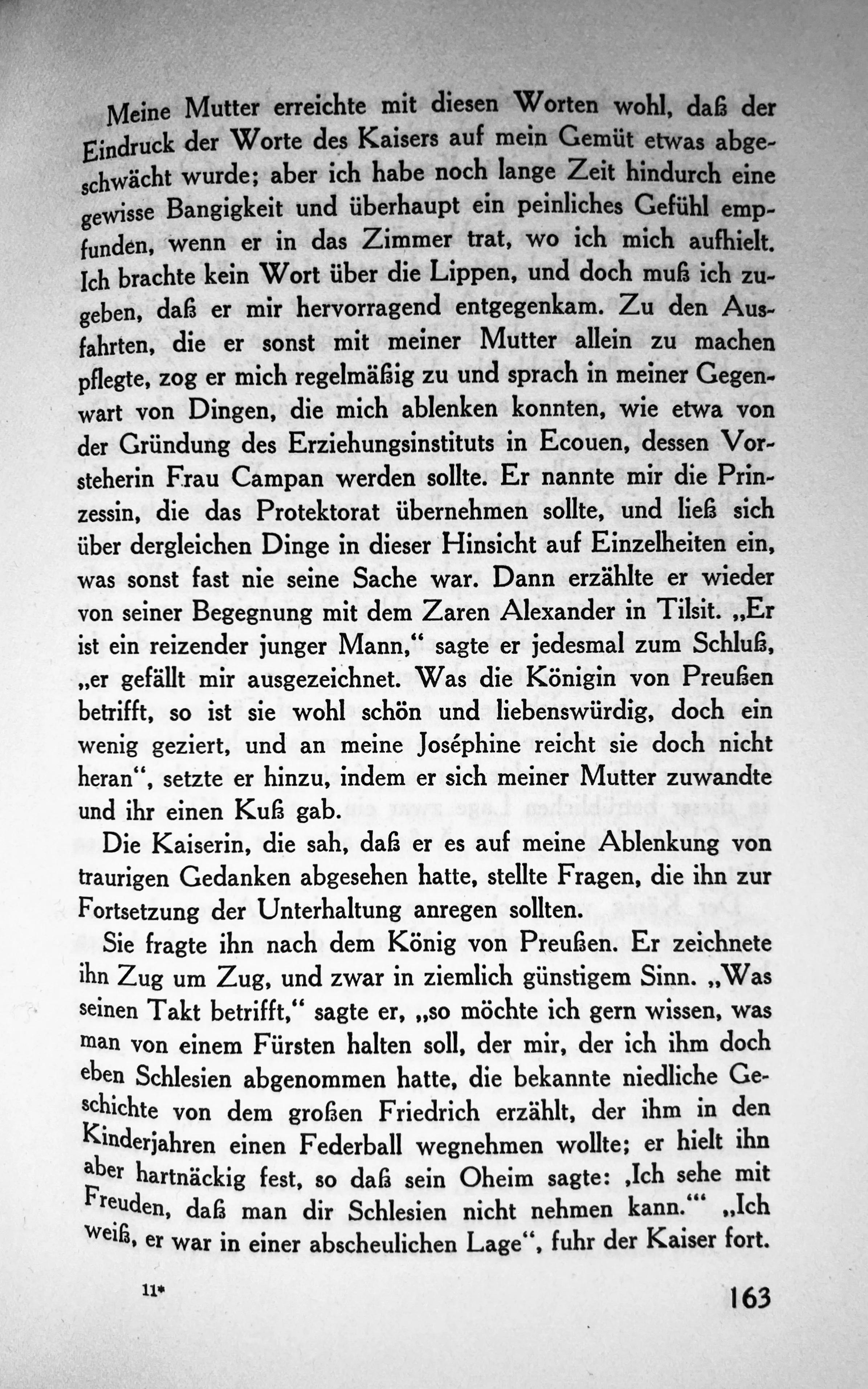 Ich brachte kein Wort über die Lippen, und doch muss ich zugeben, das er mir hervorragend entgegenkam. Zu den Ausfahrten, die er sonst mit meiner Mutter allein zu machen pflegte, zog er mich regelmäßig zu und sprach in meiner Gegenwart von Dingen, die mich ablenken konnten, wie etwa von der Gründung des Erziehungsinstituts in Ecouen, dessen Vorsteherin Frau Campan werden sollte. Er nannte mir die Prinzessin, die das Protektorat übernehmen sollte, und ließ sich über dergleichen Dinge in dieser Hinsicht auf Einzelheiten ein, was sonst fast nie seine Sache war. Dann erzählte er wieder von seiner Begegnung mit dem Zaren Alexander in Tilsit. „Er ist ein reizender junger Mann,“ sagte er jedesmal zum Schluss, „er gefällt mir ausgezeichnet. Was die Königin von Preußen betrifft, so ist sie wohl schön und liebenswürdig, doch ein wenig geziert, und an meine Joséphine reicht sie doch nicht heran"', setzte er hinzu, indem er sich meiner Mutter zuwandte und ihr einen Kuss gab.