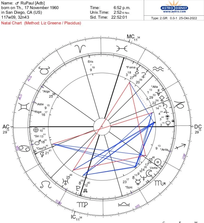 It is really amazing how strongly we can see a reflection of the facts about RuPaul in his chart. His good intentions shine and I hope that we will understand that it is in our best interests to support the unifying and empowering work which always has been his hallmark. Eccentricity and freedom are very closely aligned.