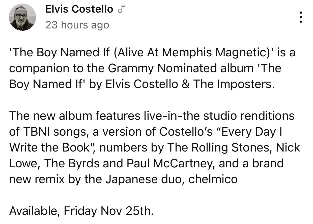 A new release from EC is coming Friday 11.25: The Boy Named If (Alive At Memphis Magnetic) November 22, 2022 Elvis Costello’s site