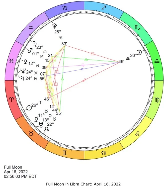 On Saturday afternoon, the Full Moon occurs when the Sun in Aries forms an opposition to the Libra Moon. It’s a time of culmination and the promise of fulfillment of something begun at the New Moon. Heightened emotions, romance, fertilization, relationship drama, and epiphanies are themes.