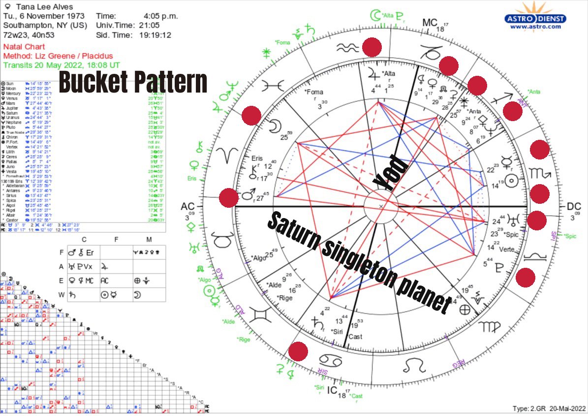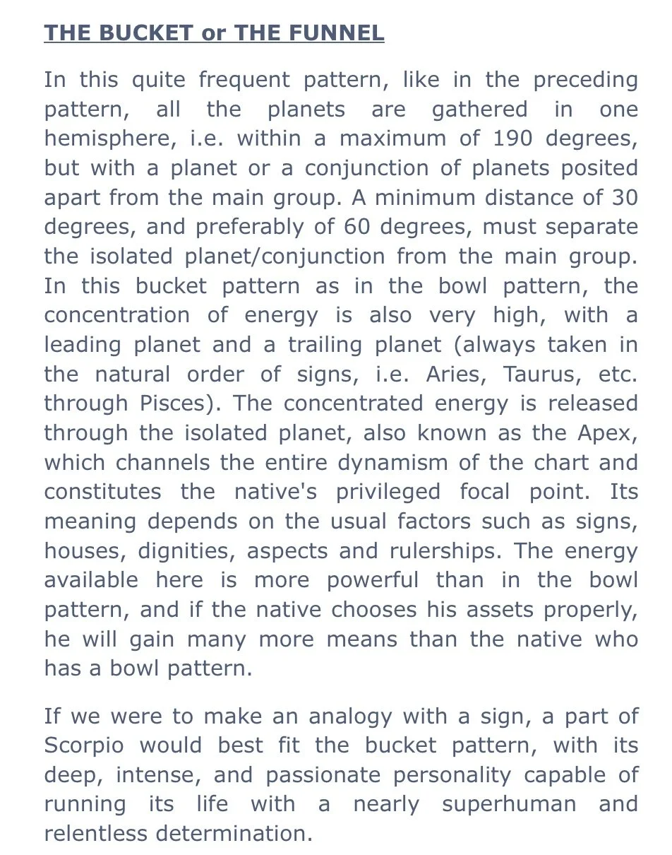 I plan on describing the bucket formation in my natal chart on my stream tonight. The following is shared from astro.com