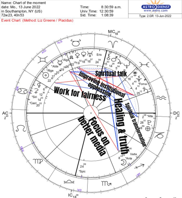 Note that transiting Venus is Conjunct Black Moon Lilith. Koand likes to make waves and doesn’t seem to mind getting me involved on top of what I’m already doing. Transiting Neptune and Pallas Athena are Conjunct as they are also in my natal chart. This is a Paladin type energy. It’s the best aspected spot on my chart.