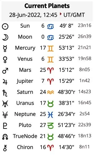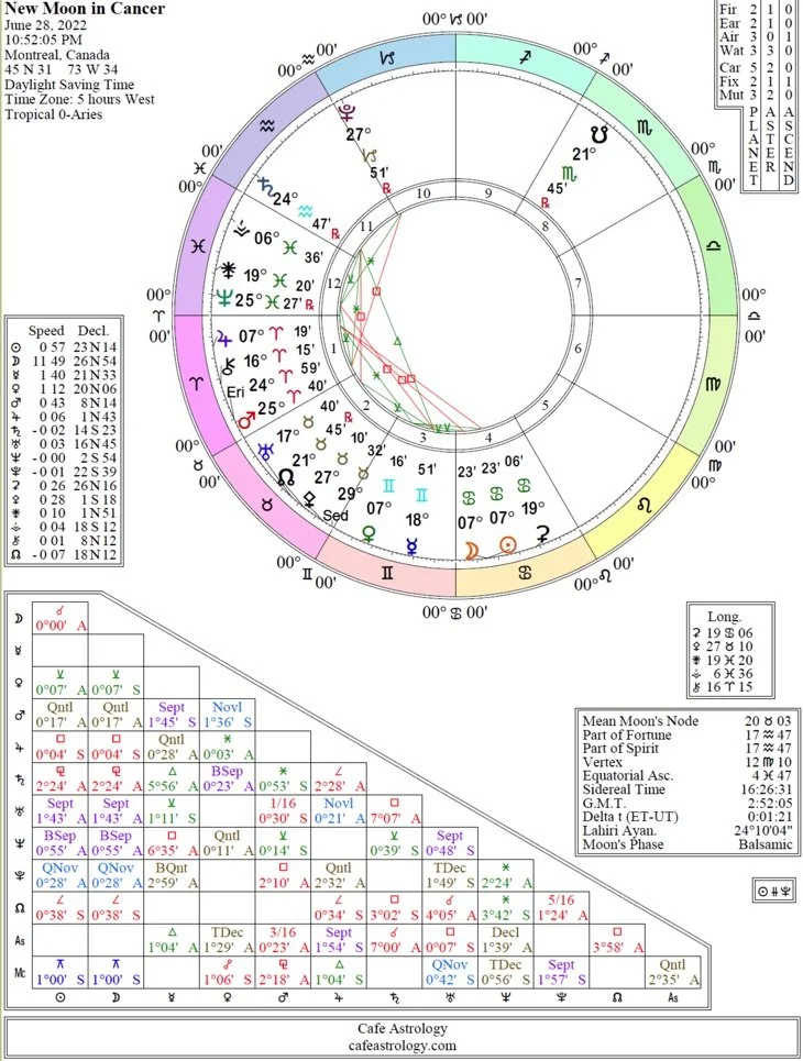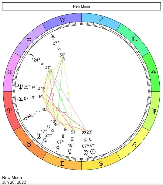 The Moon is New in Cancer on June 28, 2022, at 10:52 PM EDT.
