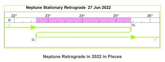 Neptune stations and turns retrograde on June 27, 2022, at 25° Pisces 27′ Rx