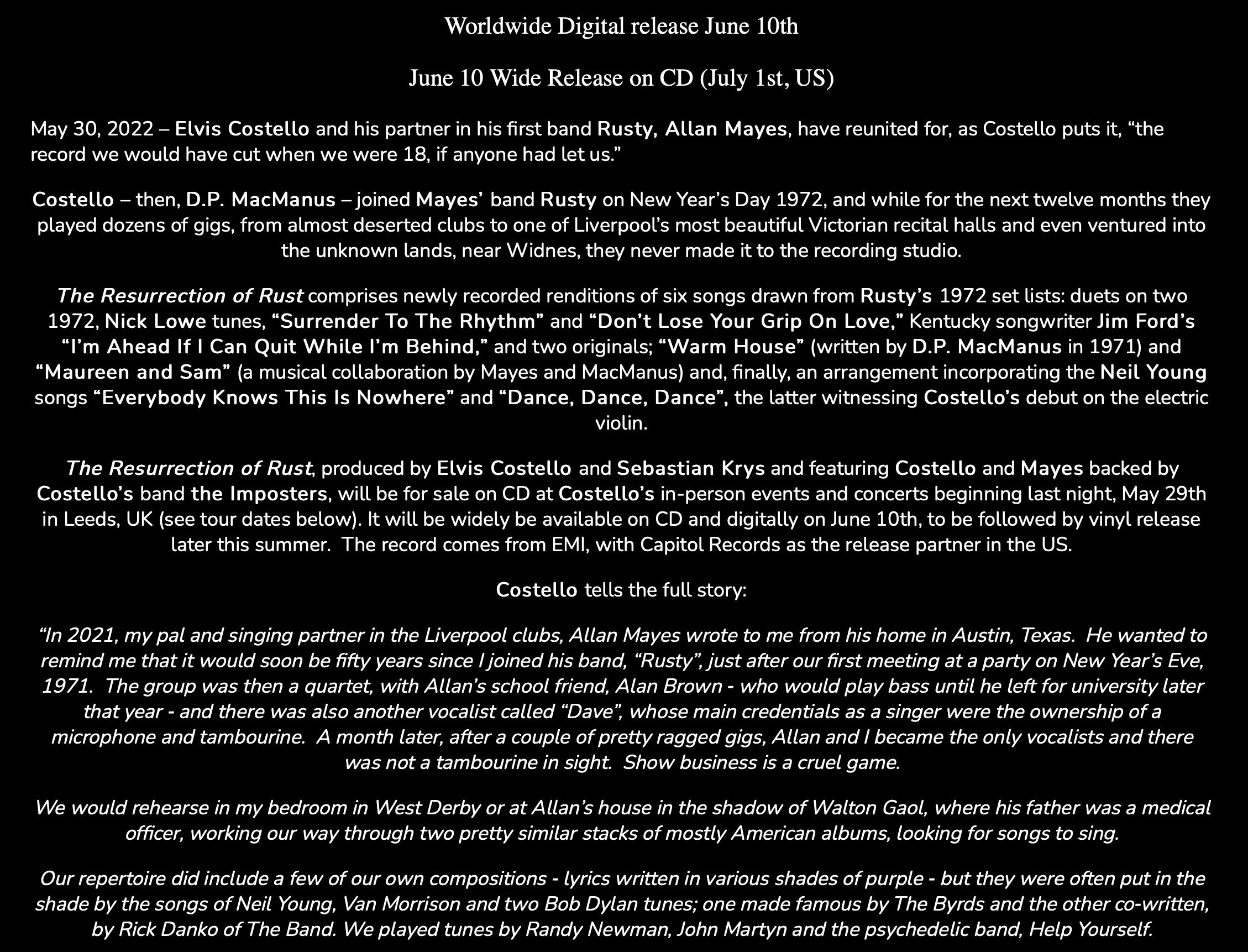 The Story of Rusty June 8, 2022 Elvis Costello tells the story of joining his first band, Rusty, and shares the fruits of its reunion on his website.
