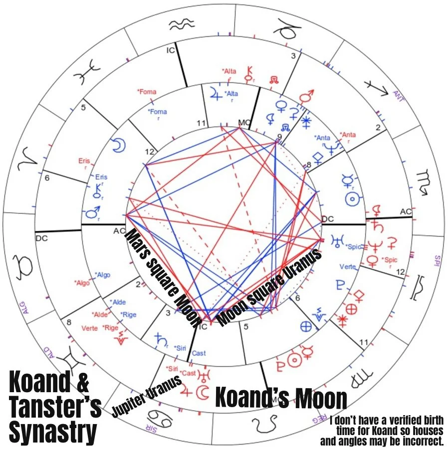 I would like to focus on certain Moon aspects in Tanster & Koand’s synastry chart. Relevant information follows: