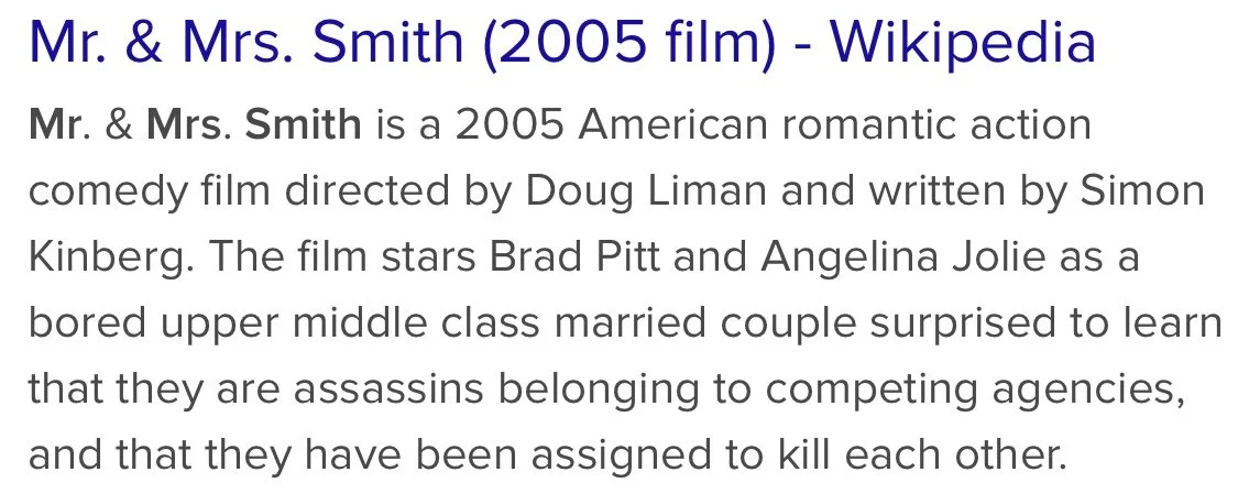 Mr. & Mrs. Smith a film about two bored upper middle class assassins who are married to each other September 7, 2022 “Truth in movies. Lies in the news.”