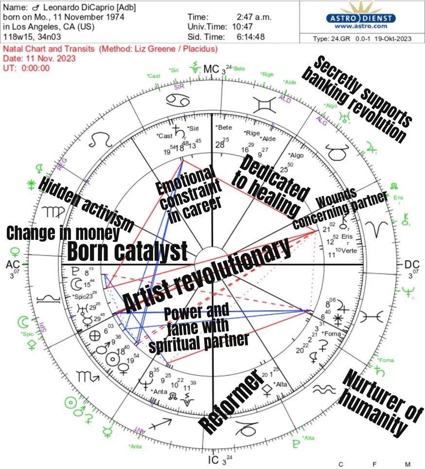 Below we have Leonardo DiCaprio’s birth chart, if we have the birth time correctly identified. Today, November 11th, would be a fantastic day to advance the idea of this artist as a leader in finance. Maximum attention is on him due to his solar return. He would be an inspiring force in changing our money system as he has Venus (money, values, art) on his ascendant (how he comes across). He also has Pluto in Libra on his ascendant, further strengthening his ability to be a force of change in the realm of finance.