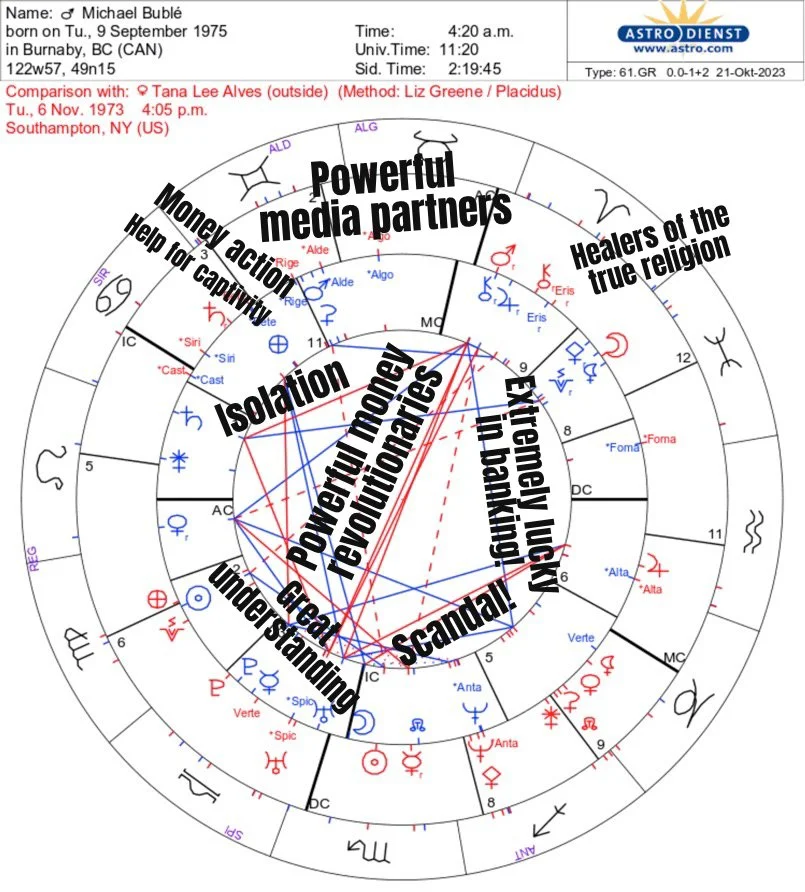 Below we have the synastry chart between Tanster and Michael Bublé. Both Michael and Tanster show Pluto and Uranus in Libra, an indication that people our age are destined to revolutionize culture and money. This Uranus alignment shows an impactful opposition with Tanster’s feisty Mars in Aries conjunct Michael’s Jupiter (expansion).