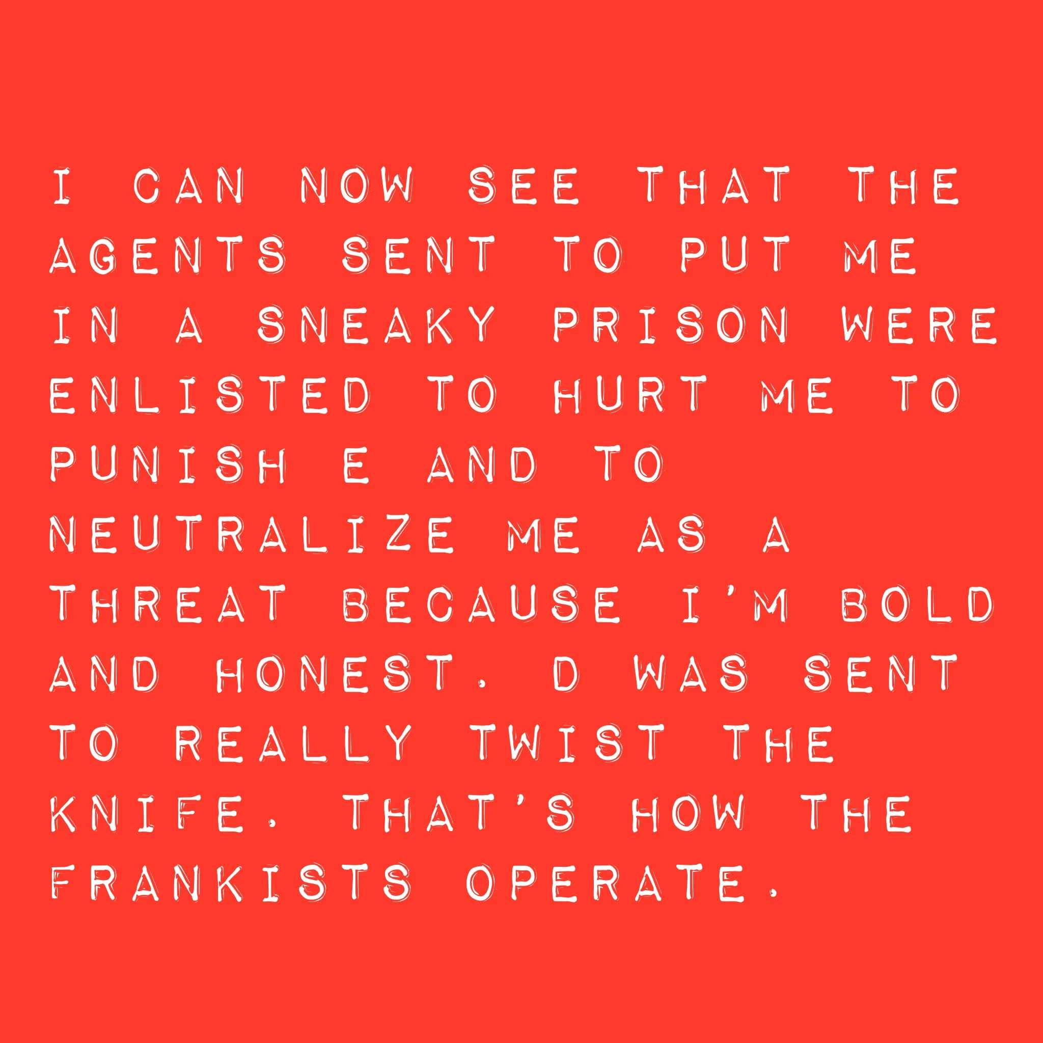 Looking back, I can see this really infuriated the Frankists who took control of E’s life and it is very likely that it had a big impact on the decisions organized crime made about my life as well. I wish I could escape R global slavery. I used to think death was the only way out. I’m sure that’s what they wanted me to think.